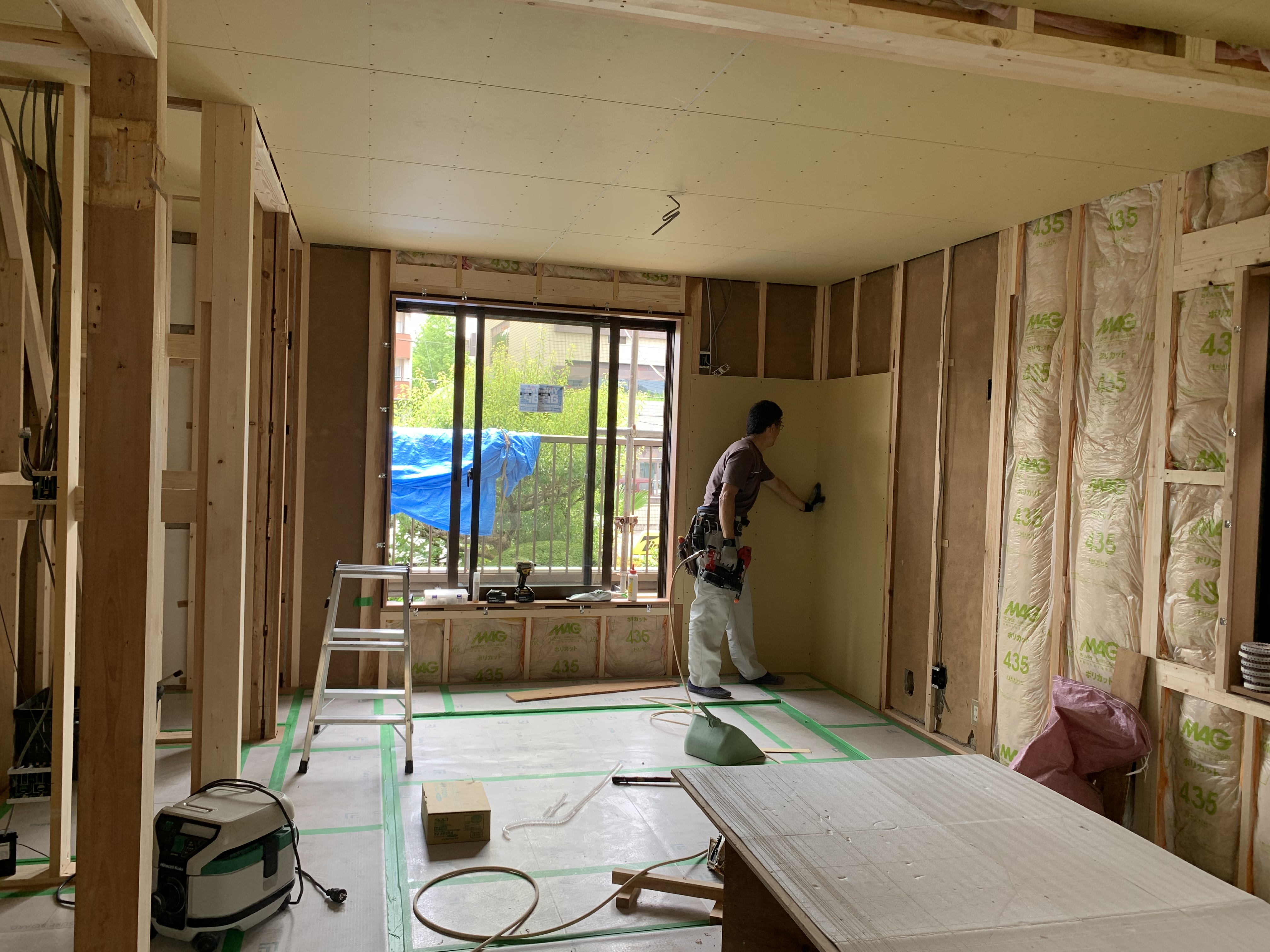 大工さんが木工事の仕上げとなる石膏ボード貼りを着々と進めています。
