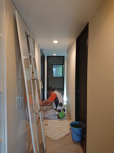 既存の壁紙を剥がし、下地処理をし、新しい壁紙を貼っていきます![]()