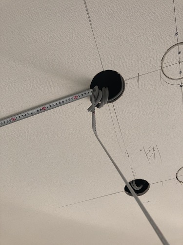 電気屋さん・寺島監督と現地で打合せを行いながら、ダウンライトの位置を決定しました。