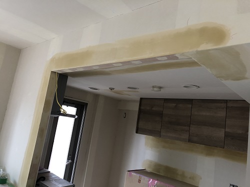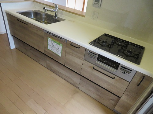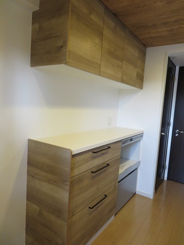 大工工事でキッチン前面の壁を加工した後は新しいキッチンを取り付けます。
