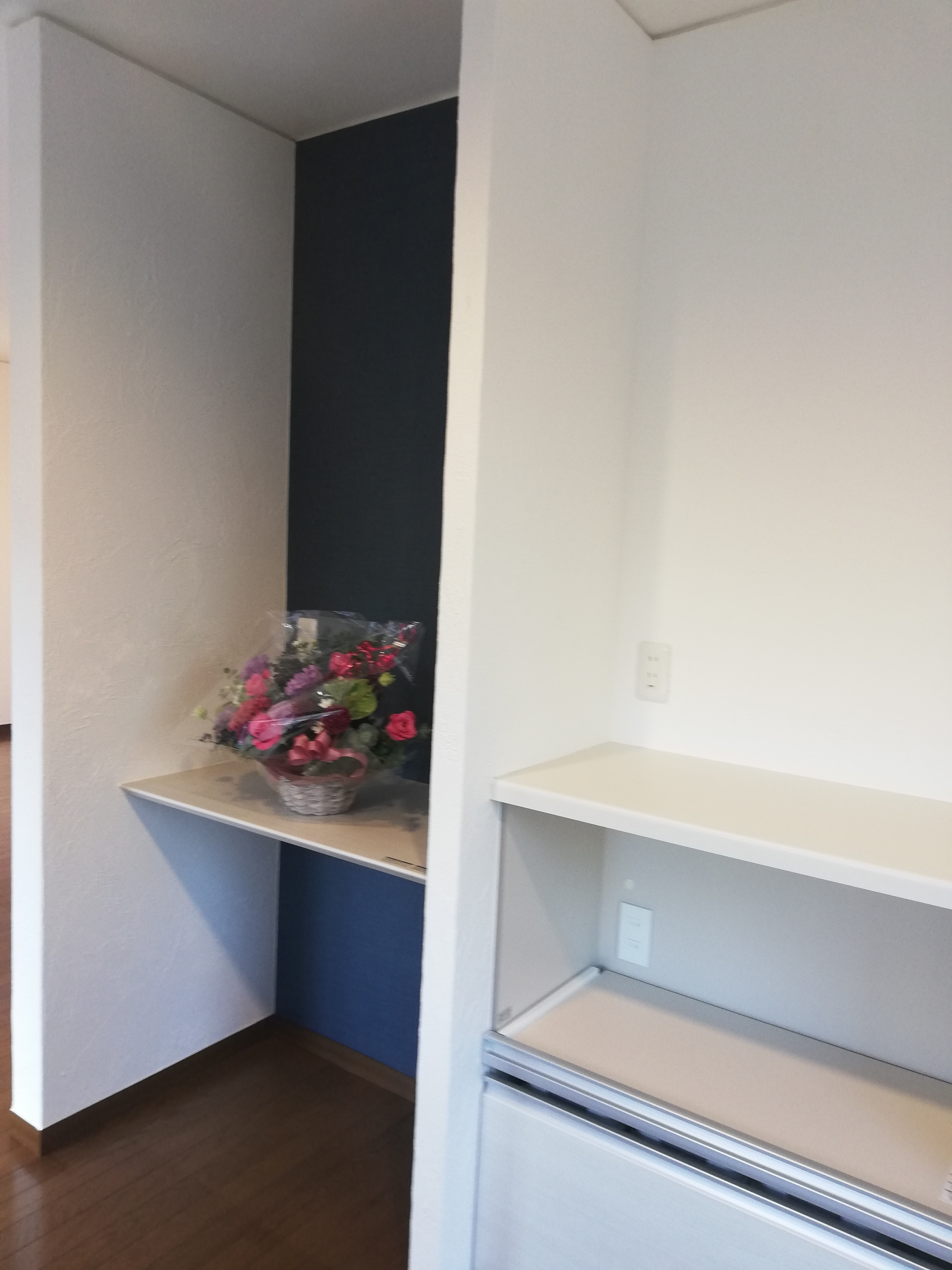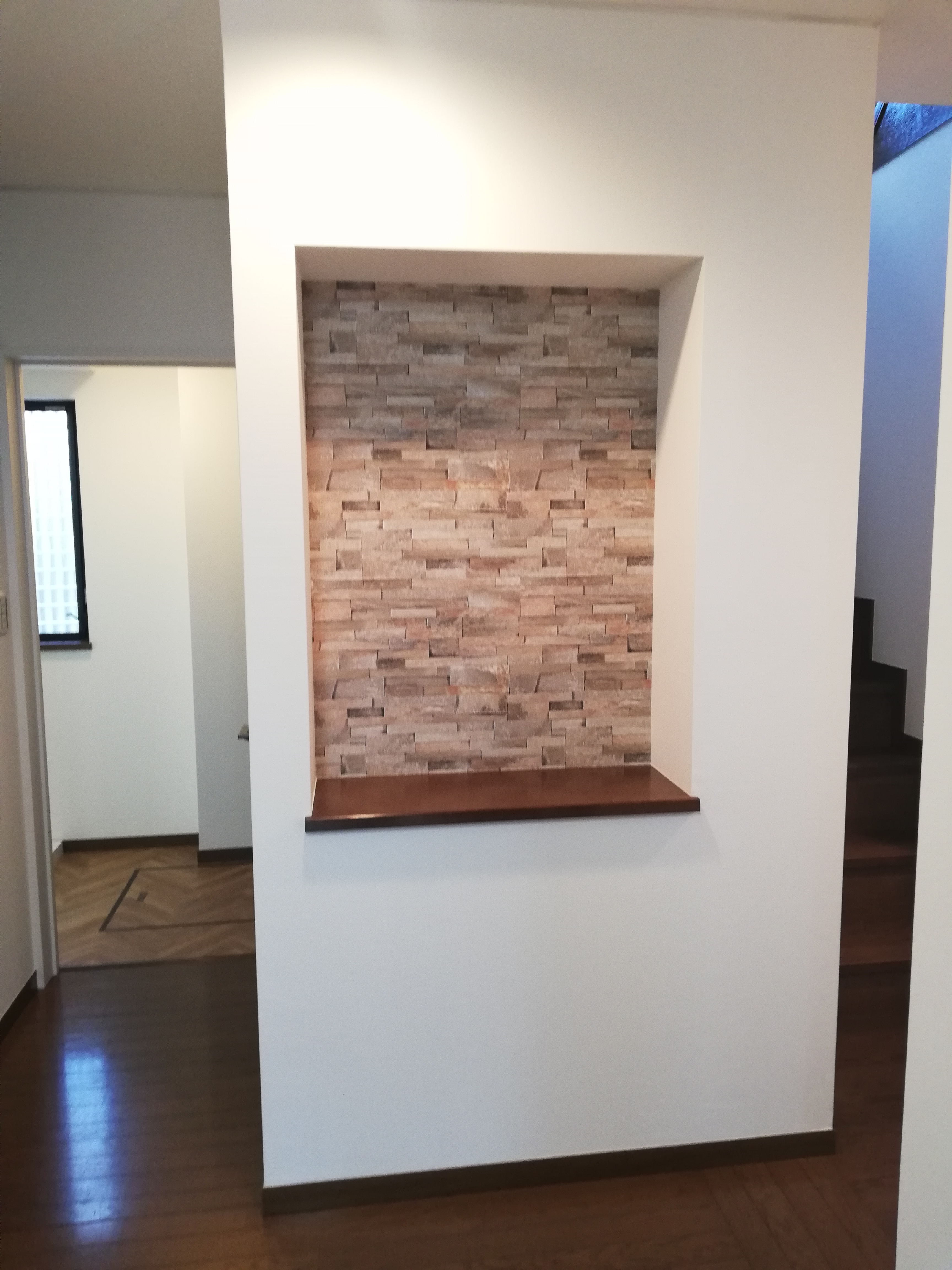 そして正面の壁面に造作の飾り棚を設置しました![]()
