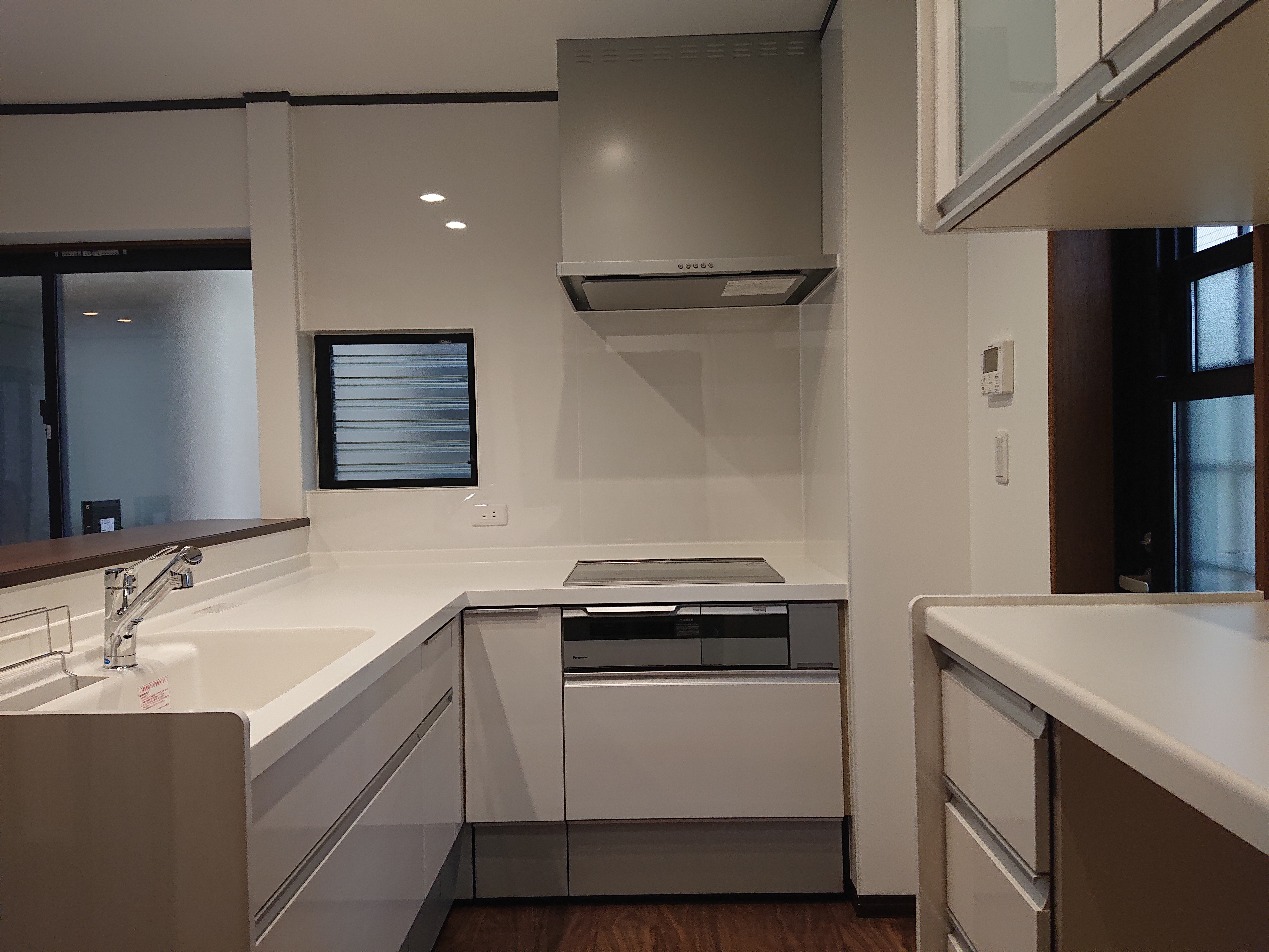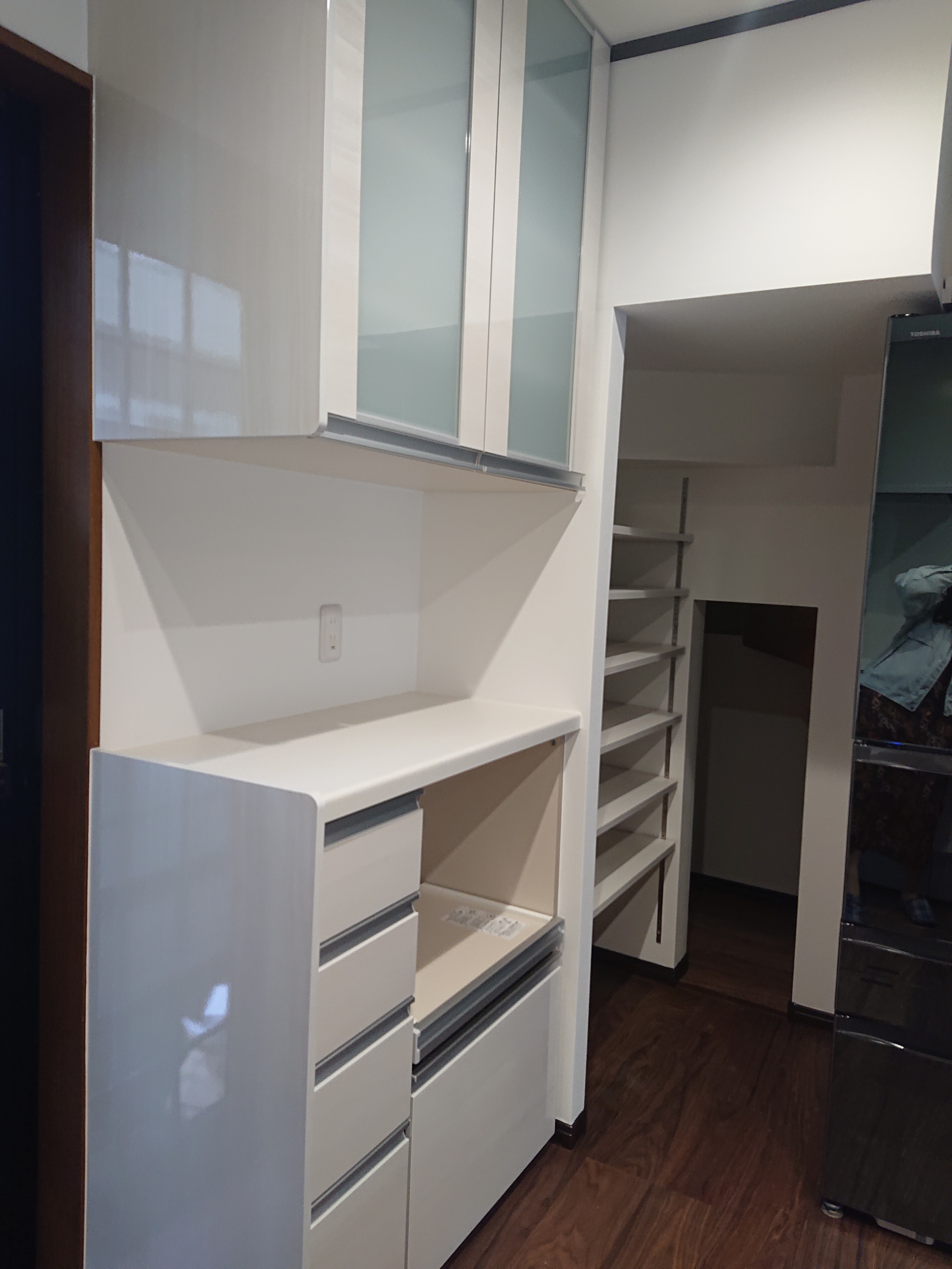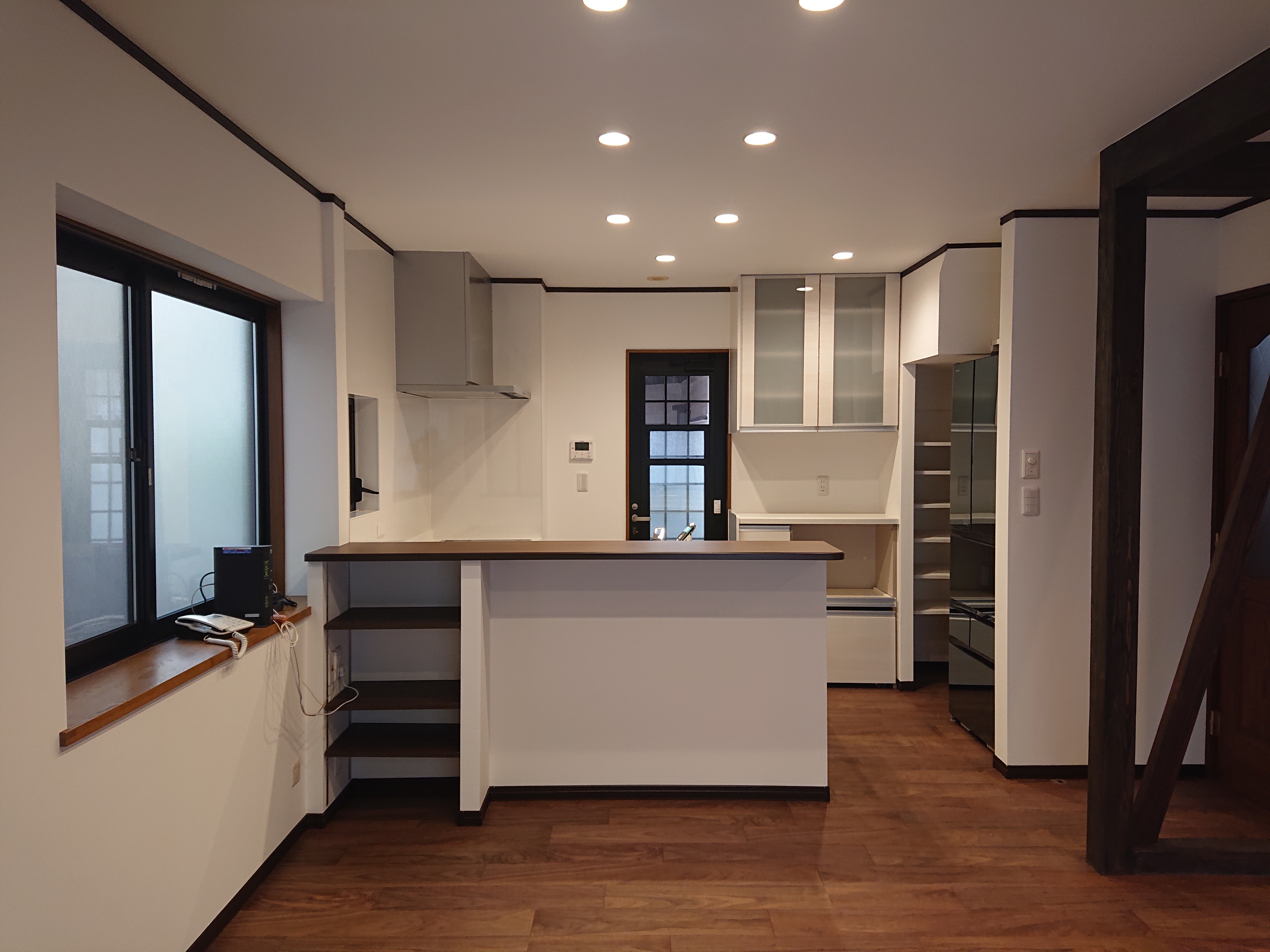 キッチンは壁などを撤去して目線が開放的に、背面にはカップボード、可動棚を設置。
