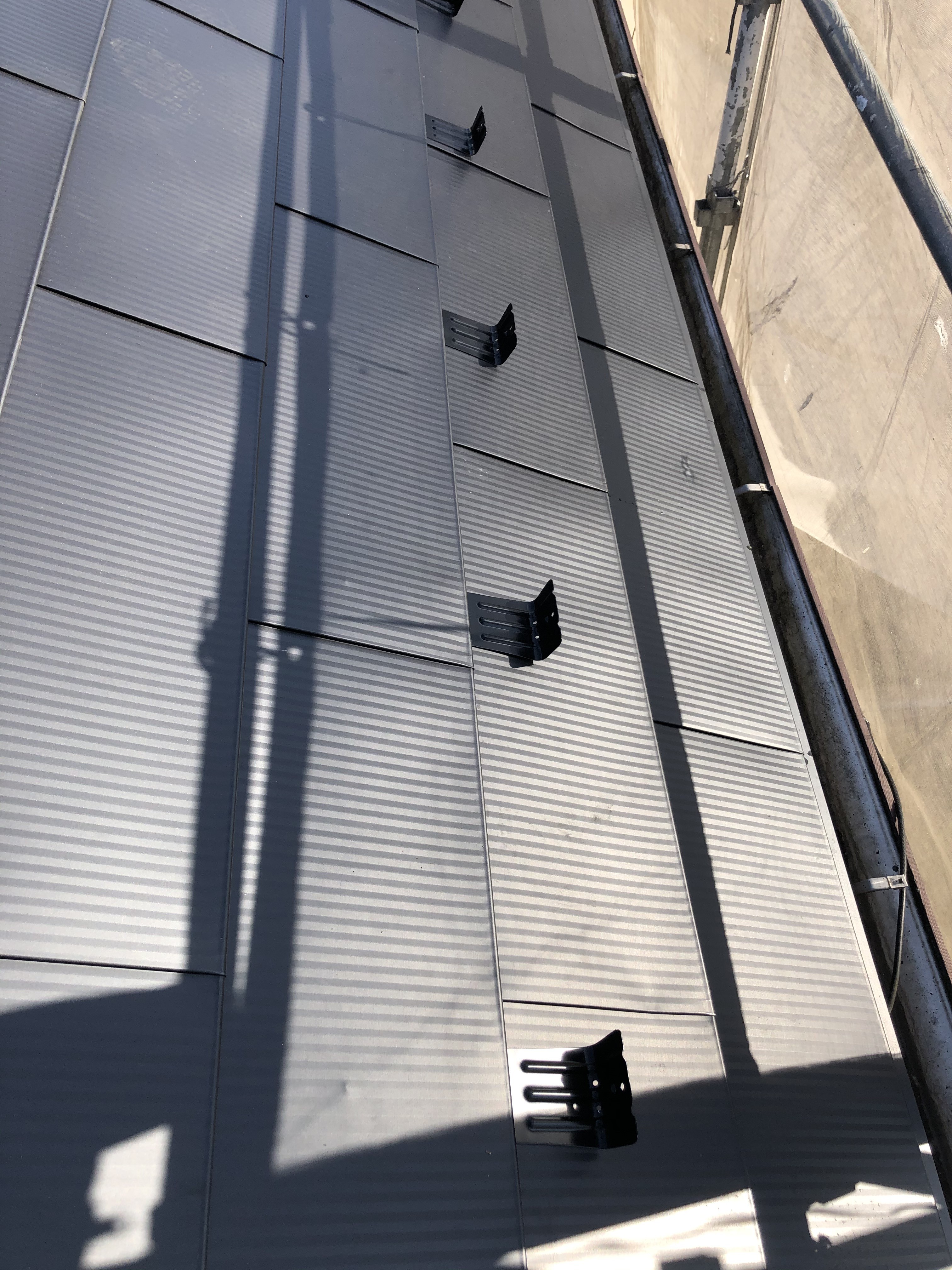 ガルバリウム鋼板の屋根材を下から葺いて行きます。
