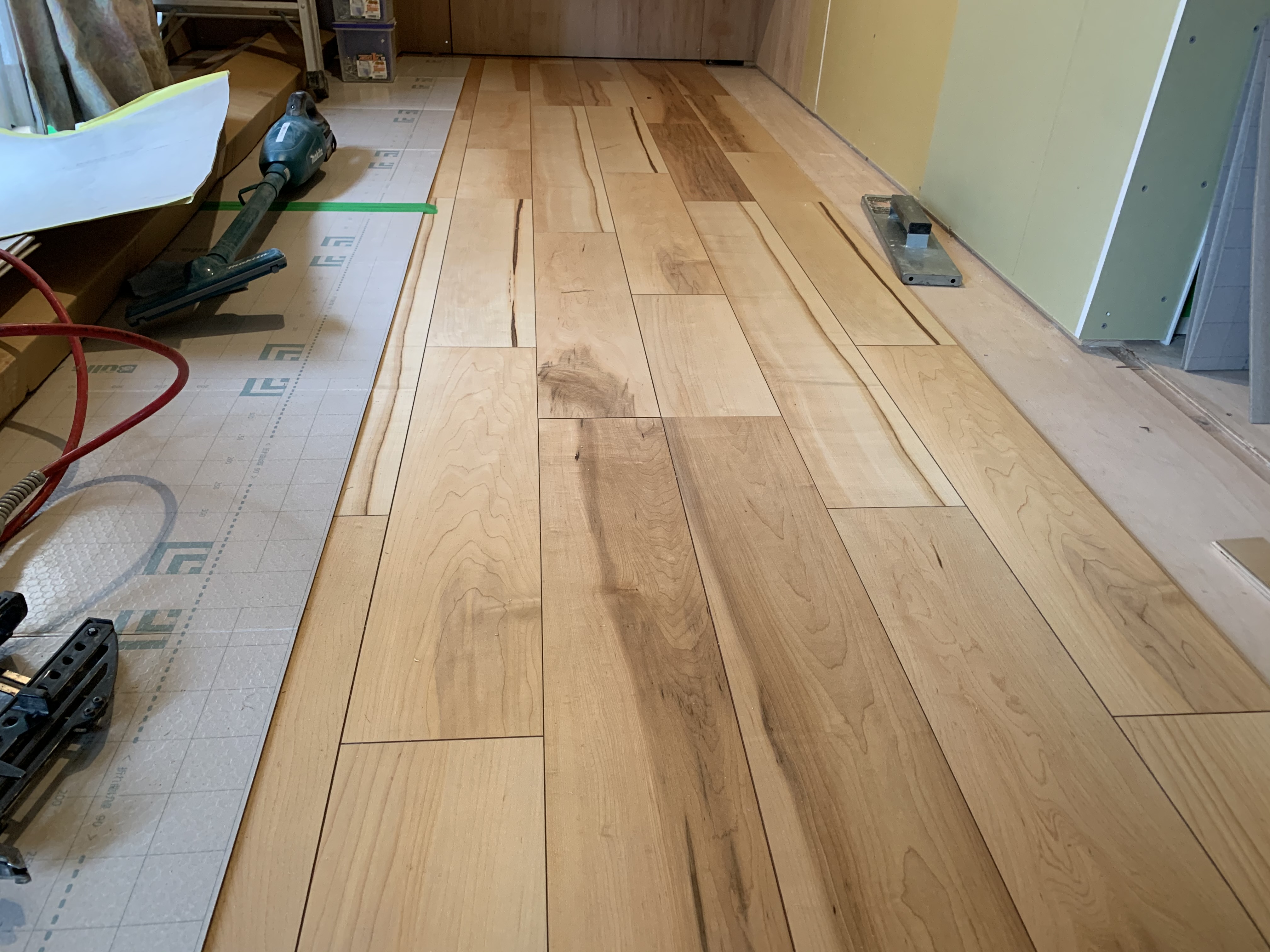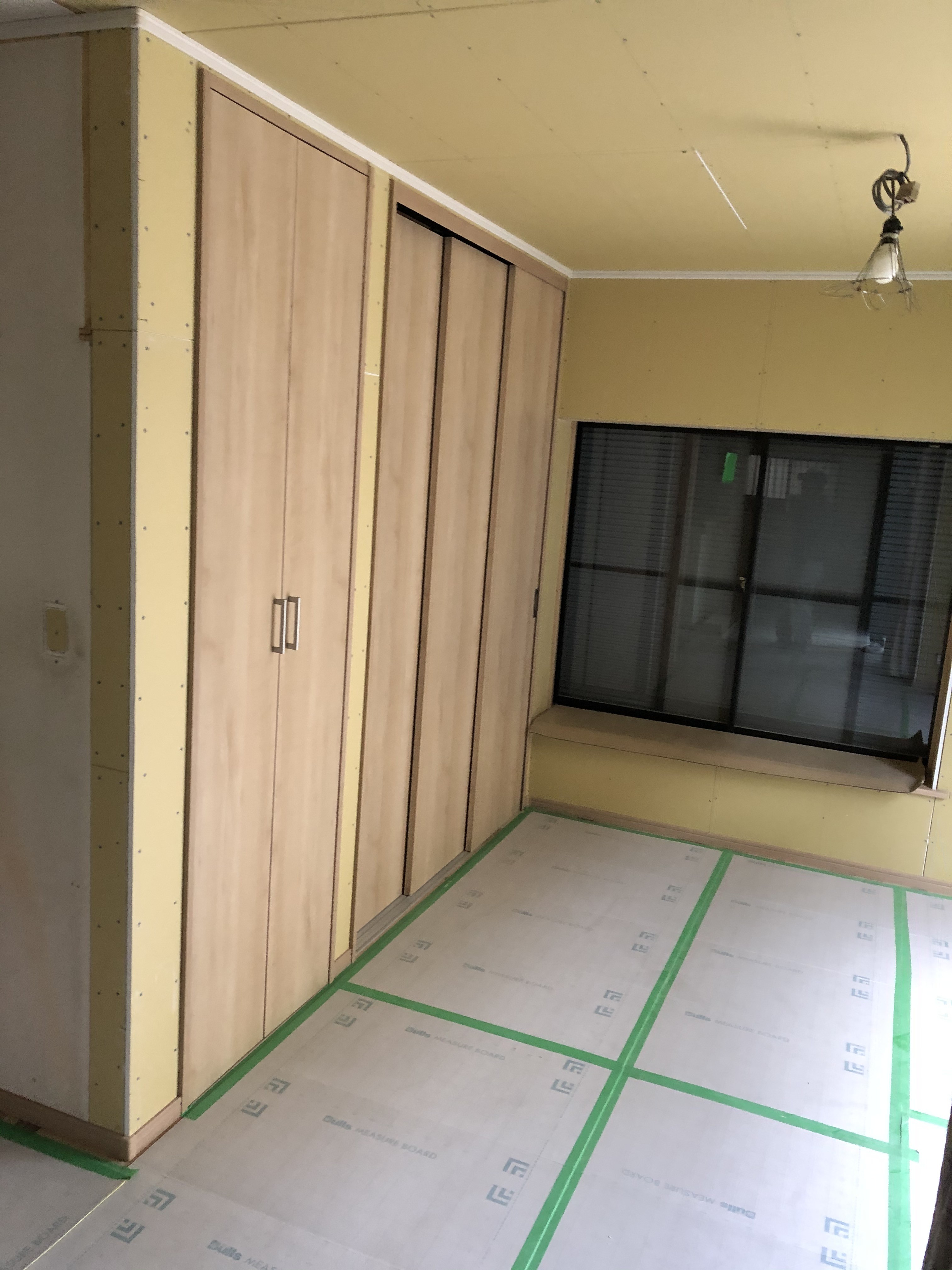 フローリングは貼り終わると、傷付かないようにすぐ養生をしてましまうのですが、