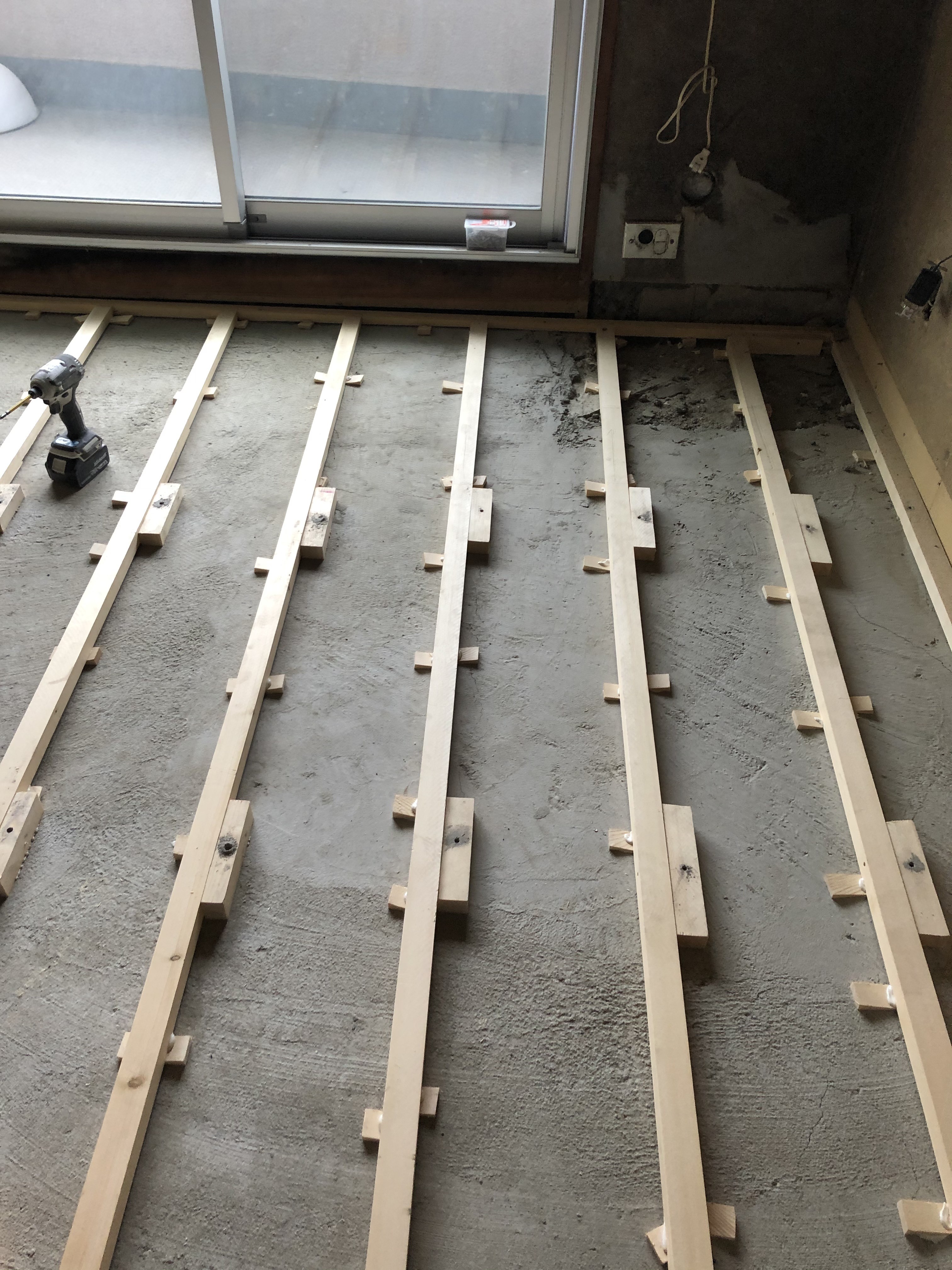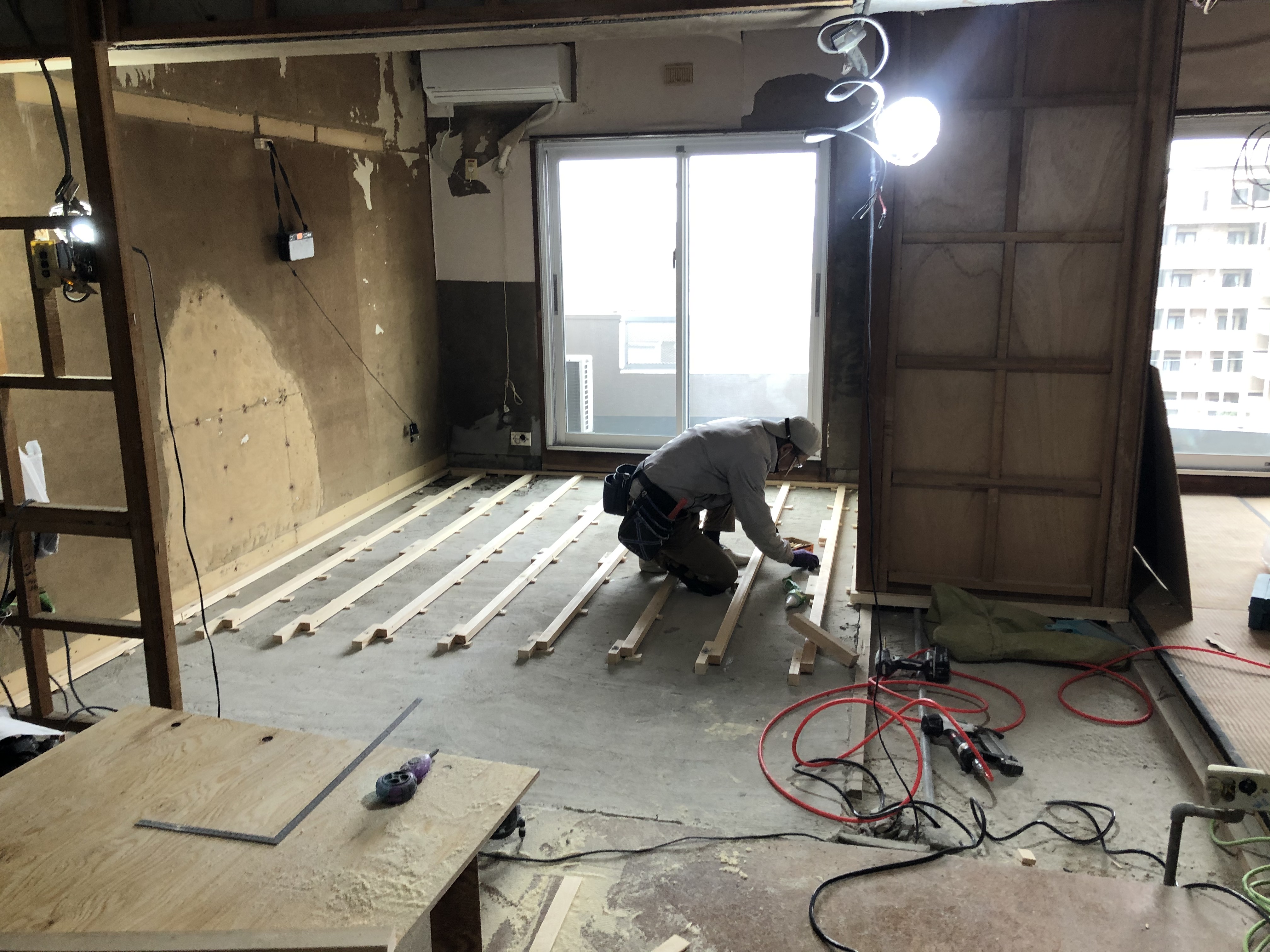 元和室の床レベルを洋室と合わせるため、根太を施工しています。