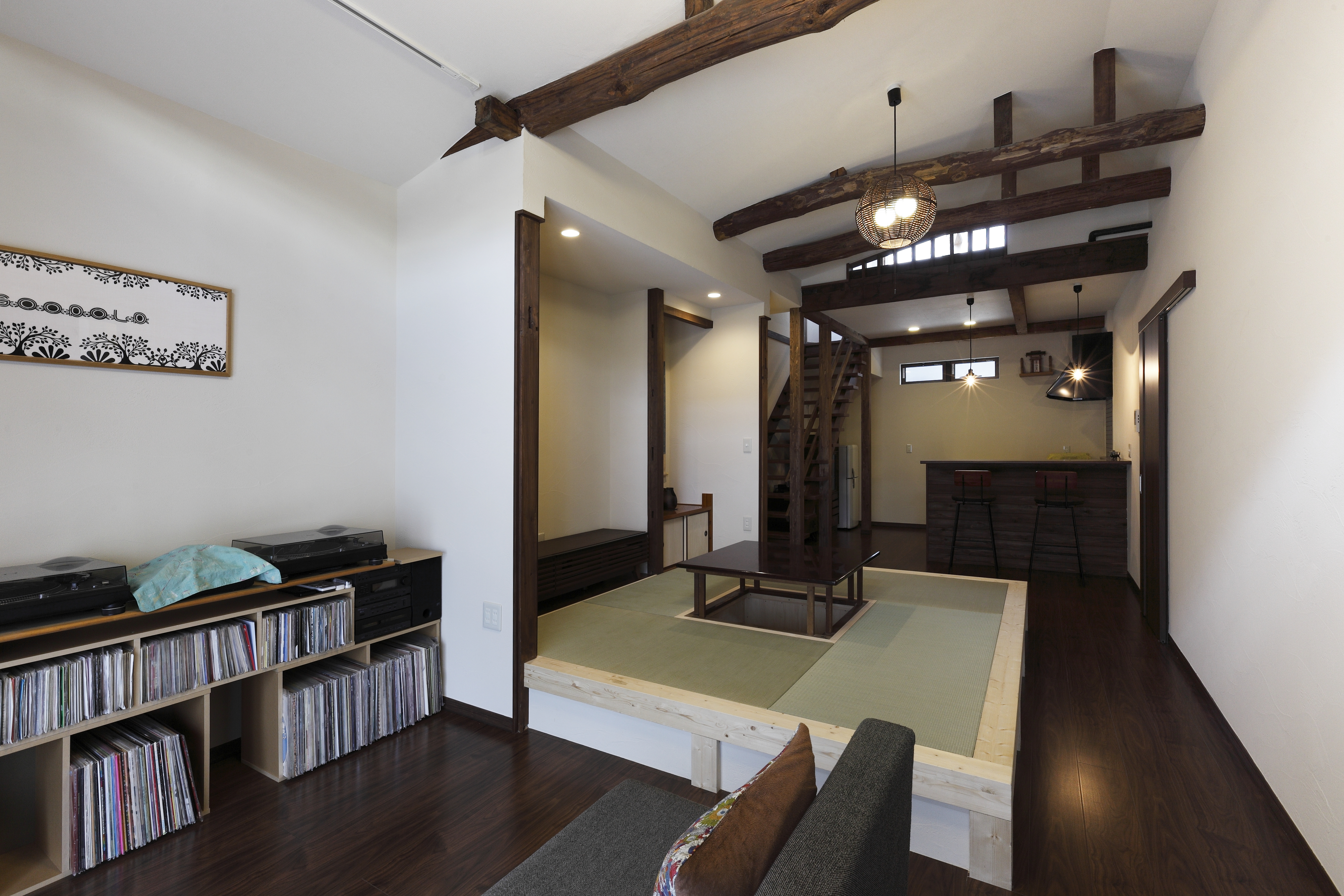 天井に古材の丸太梁が特に目を引く。八王子市、N様邸。