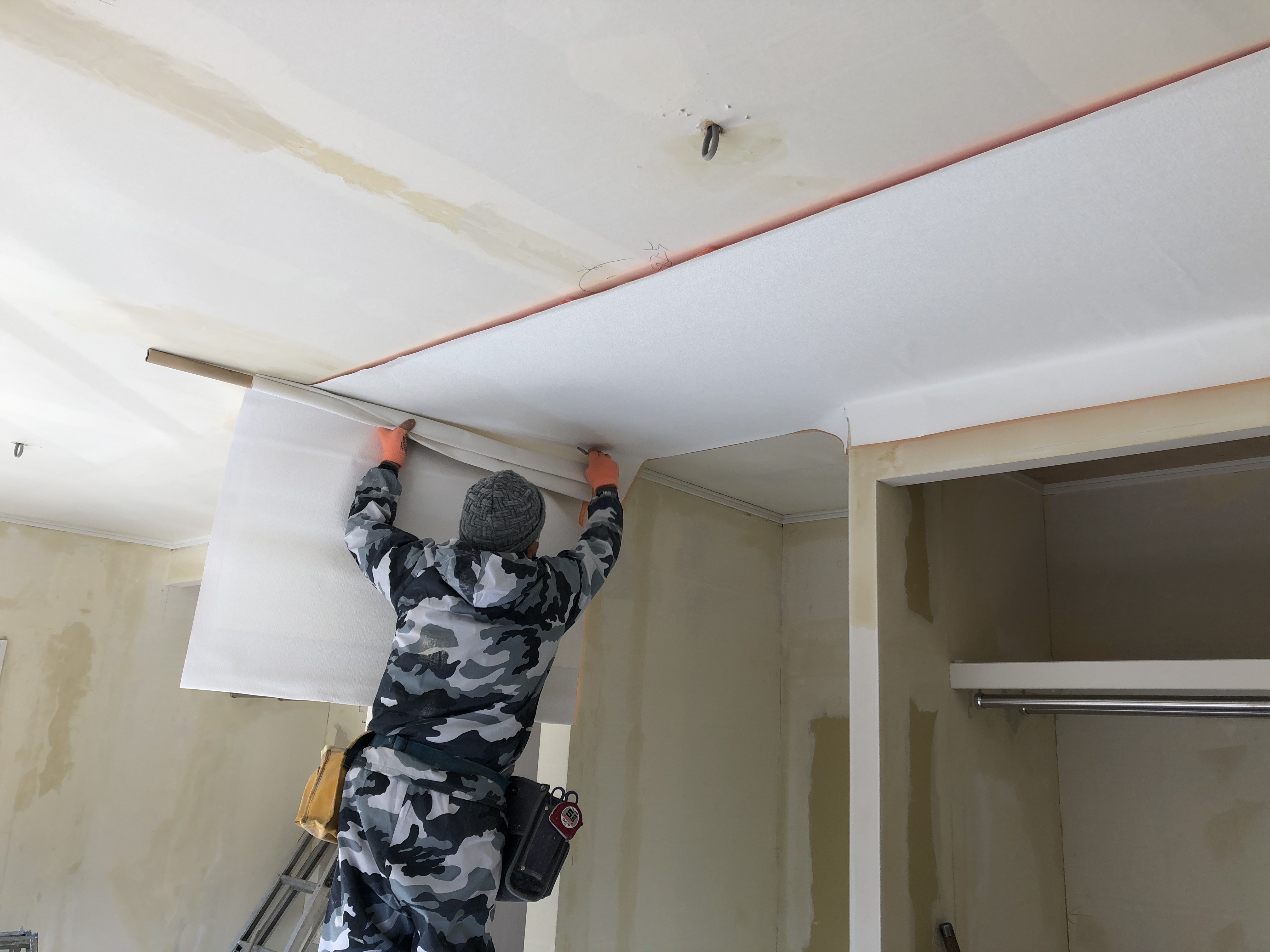大工さんの工事が終わり、内装屋さんがクロスを貼り始めています