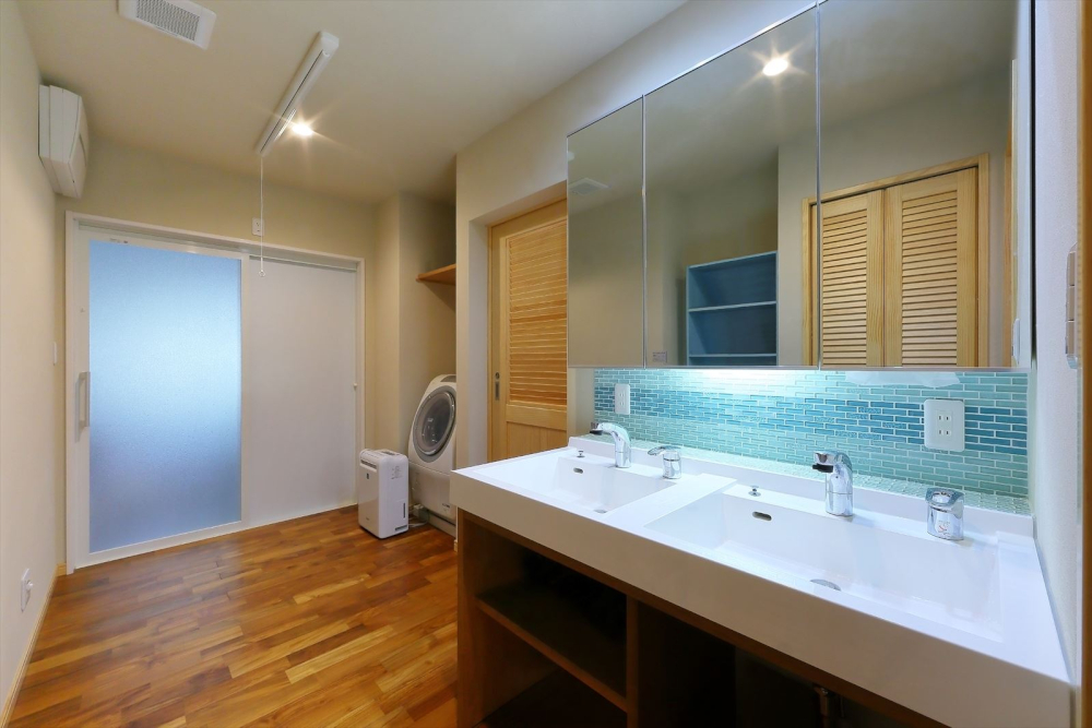 洗面台はダブルシンクの造作洗面となっております。アクセントにブルーのモザイクタイルで爽やかな雰囲気になっていますね。