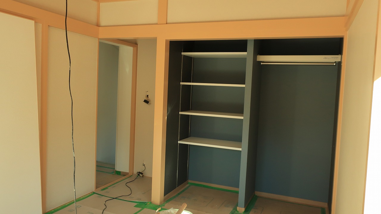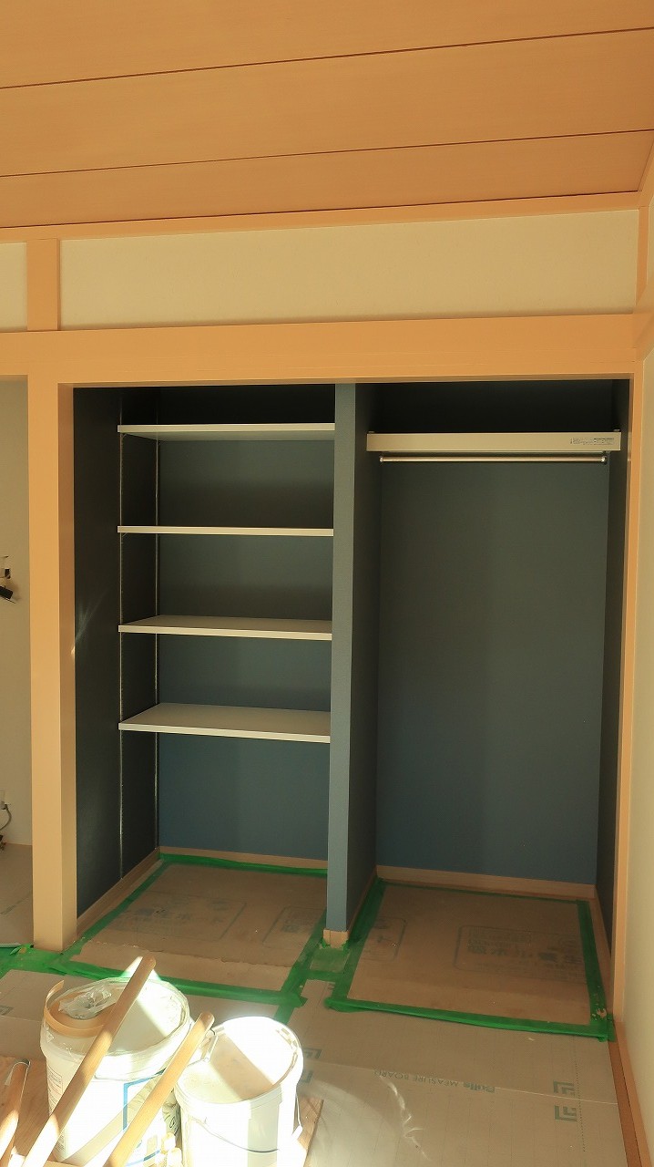 押し入れの中はブルーとブラックの2色のクロスを貼り分けてガラッと印象を変えています。