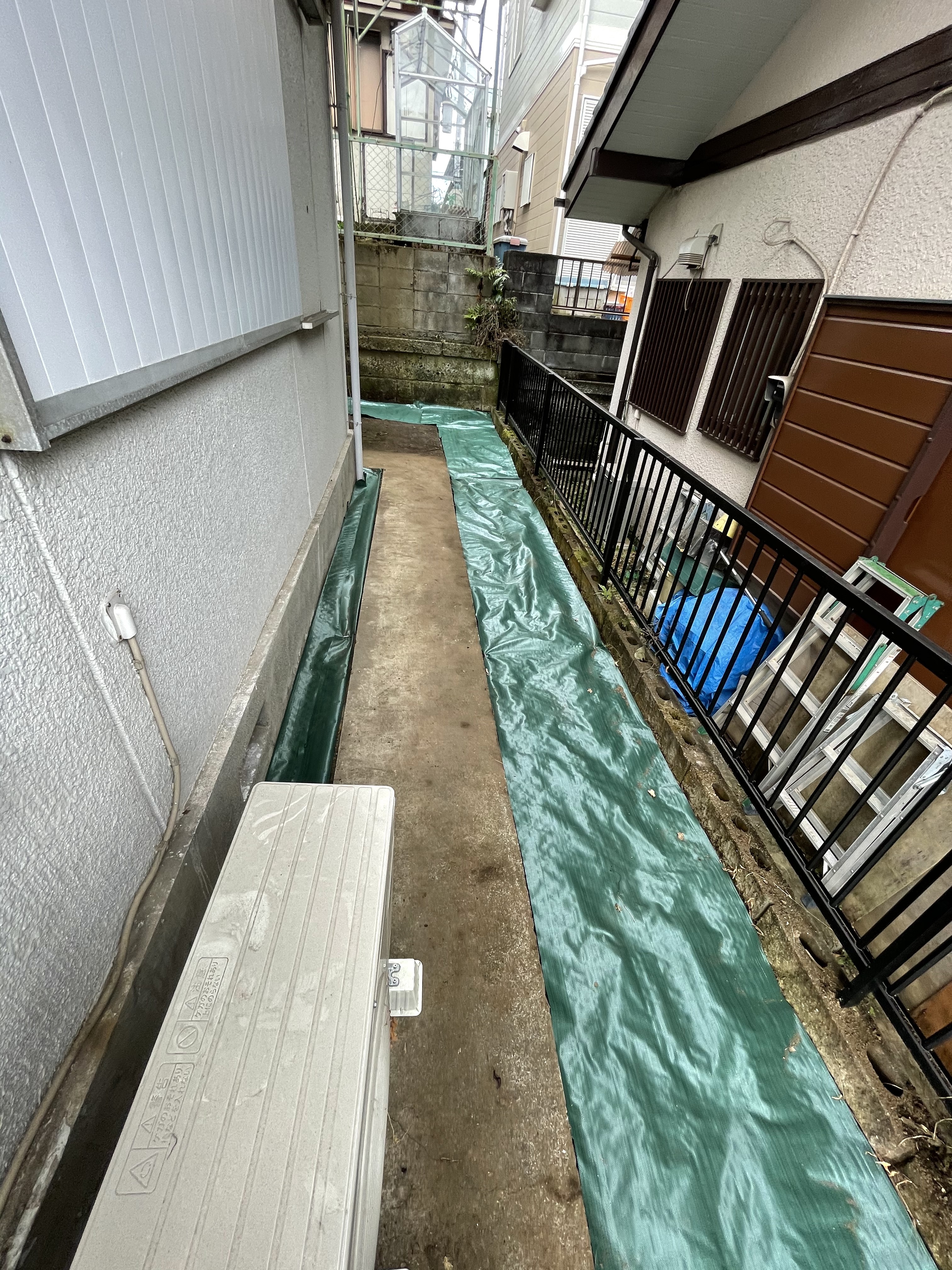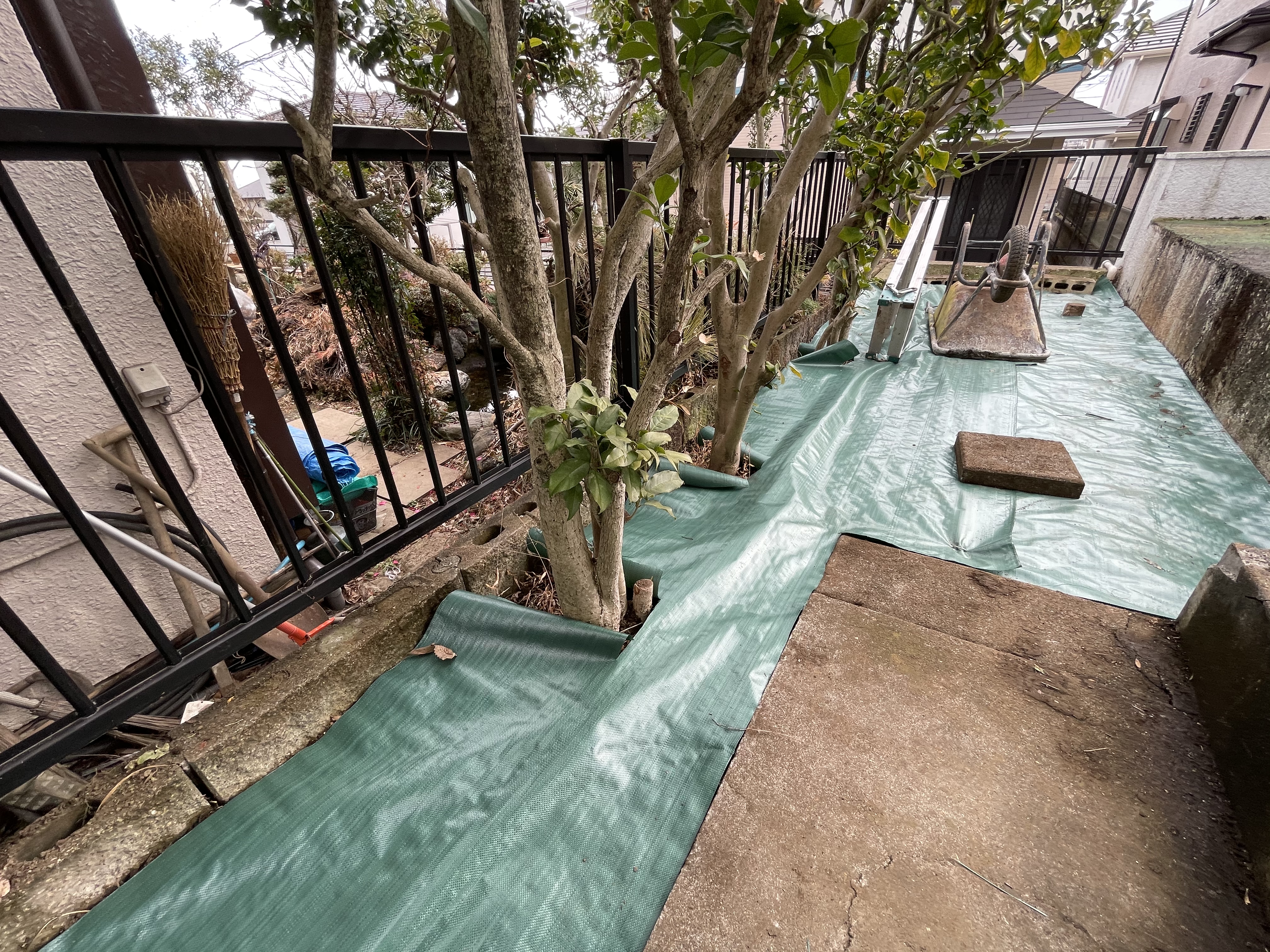 まず家の周りの草むしりを行い、雑草が生えないよう「防草シート」を敷き詰めました。