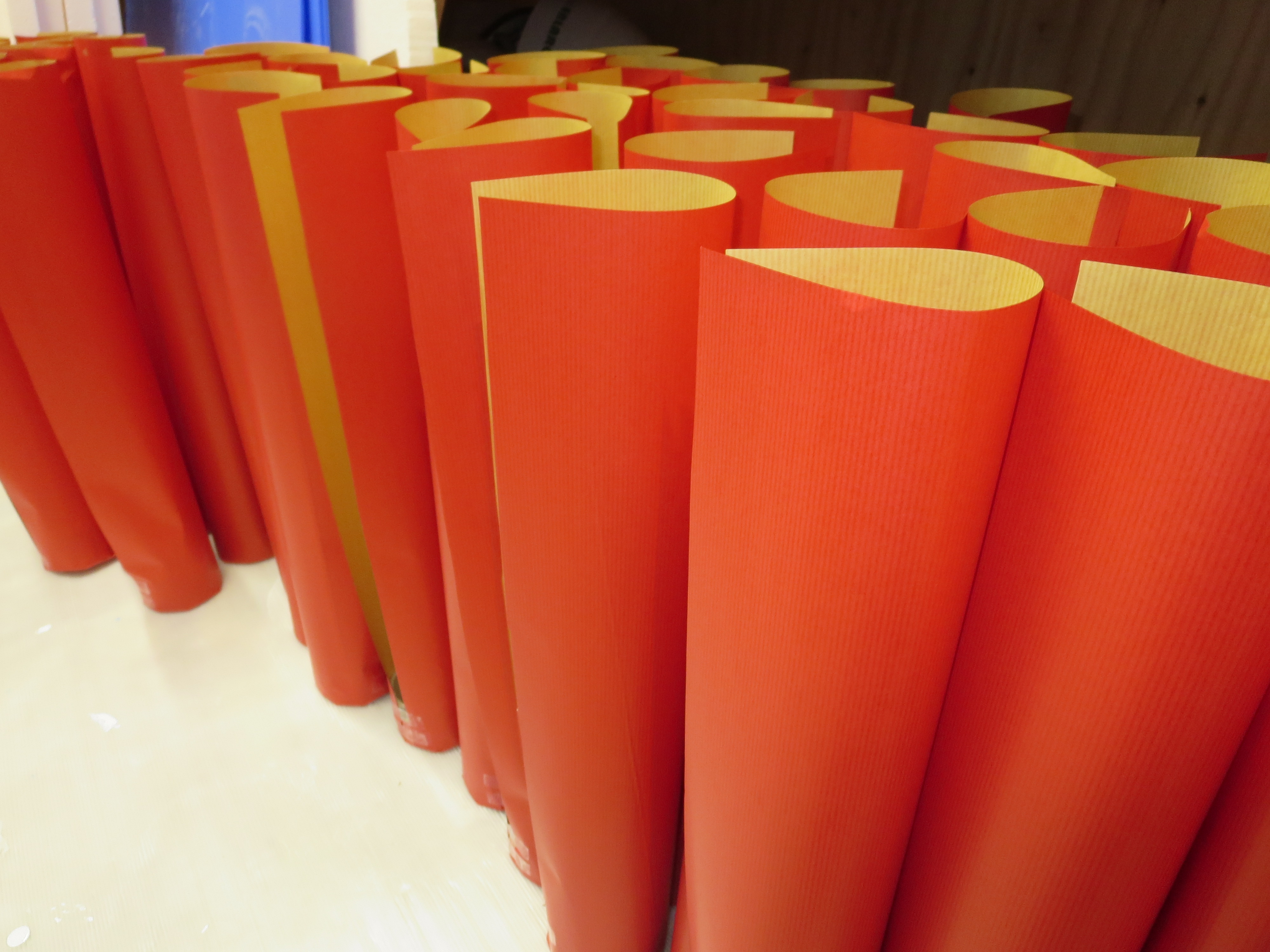 八王子店の小川監督と村松監督は、赤い筒をたくさん作っています。