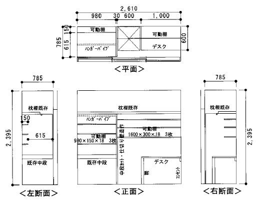 左側の収納部は、既存の中段・枕棚を残してデスク部と間仕切り手前にハンガーパイプ、