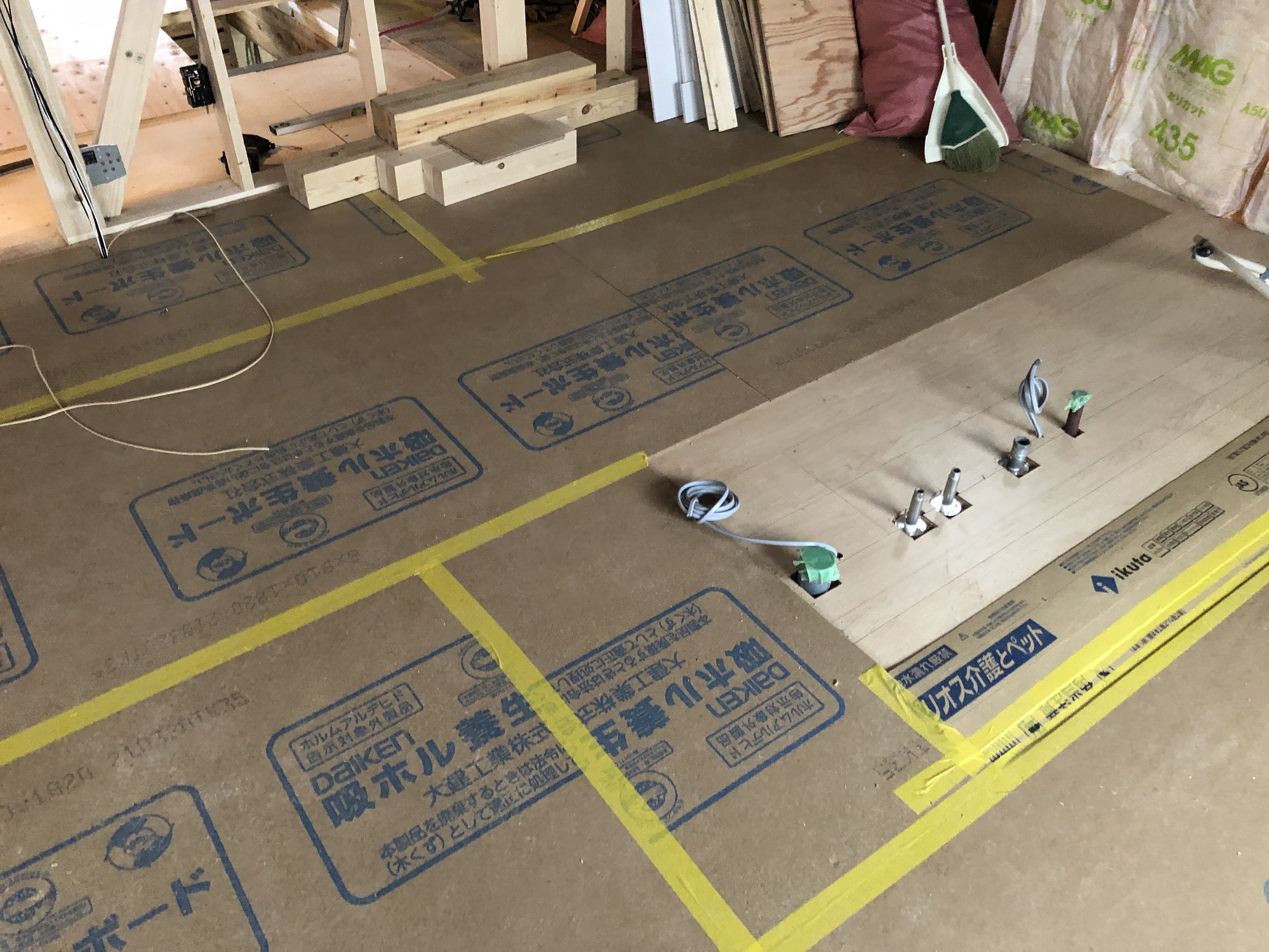 フローリングを貼ったら、即養生を貼って傷や汚れを防ぎます。