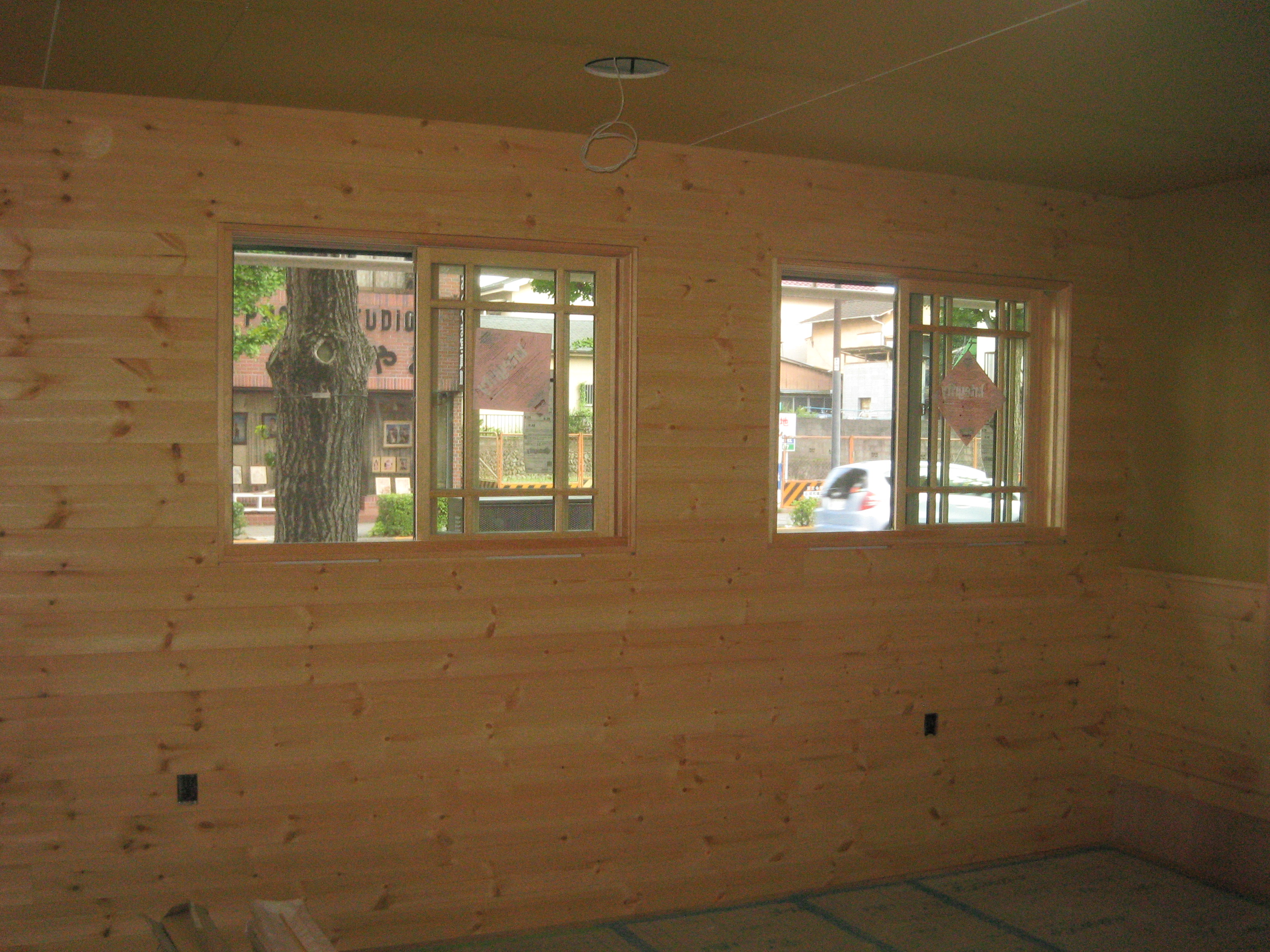 壁の内装はパインの羽目板とスイス漆喰塗りのナチュラルな組み合わせです。