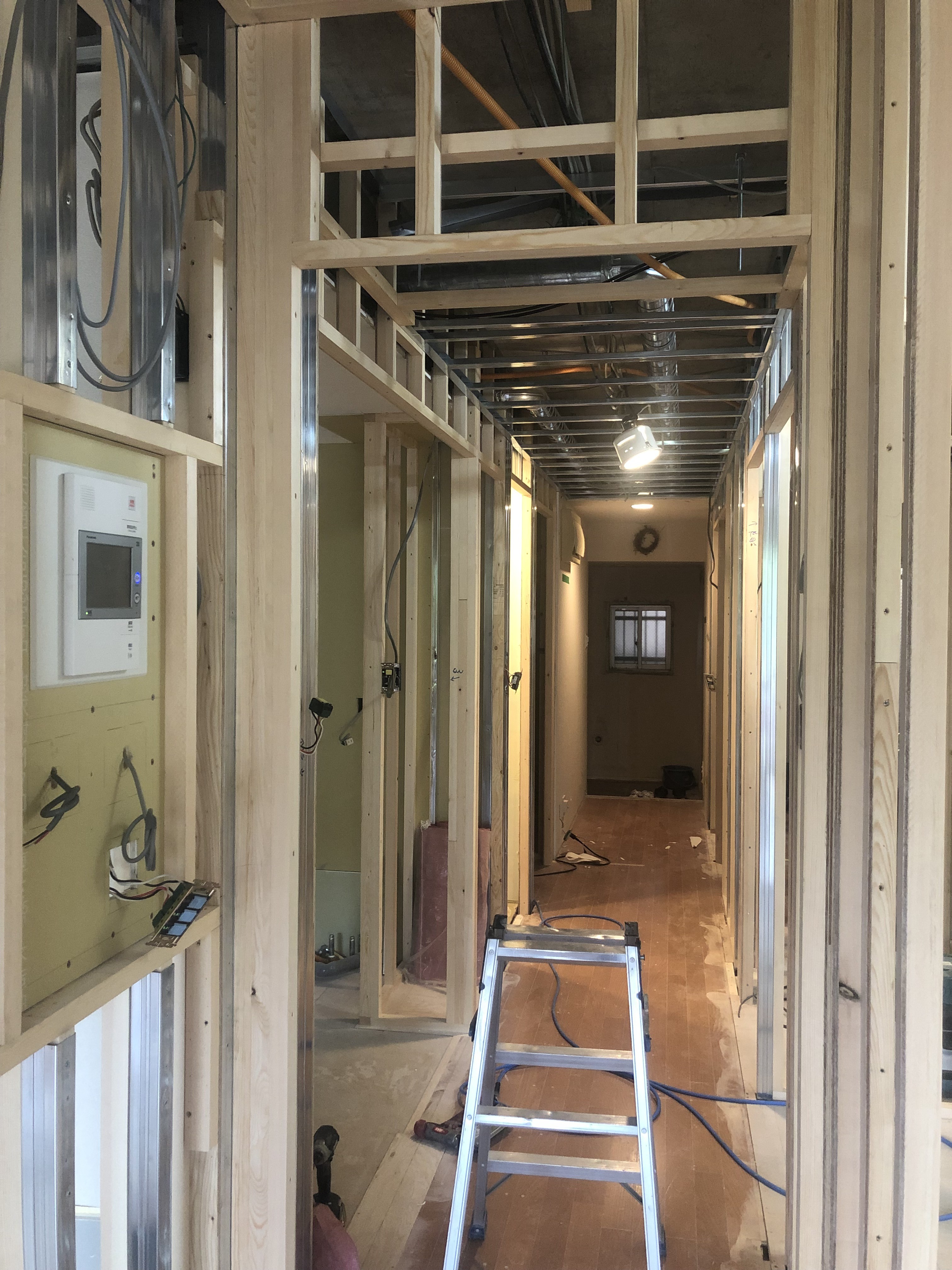 リビングから廊下にかけても、木工事が着々と進んでいます。