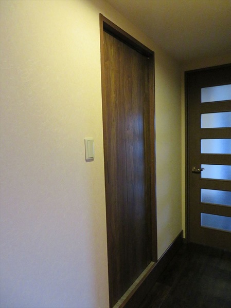 洗面所の扉は開き戸でしたが、使いづらく危ないため、今回の工事で引き戸にしています![]()