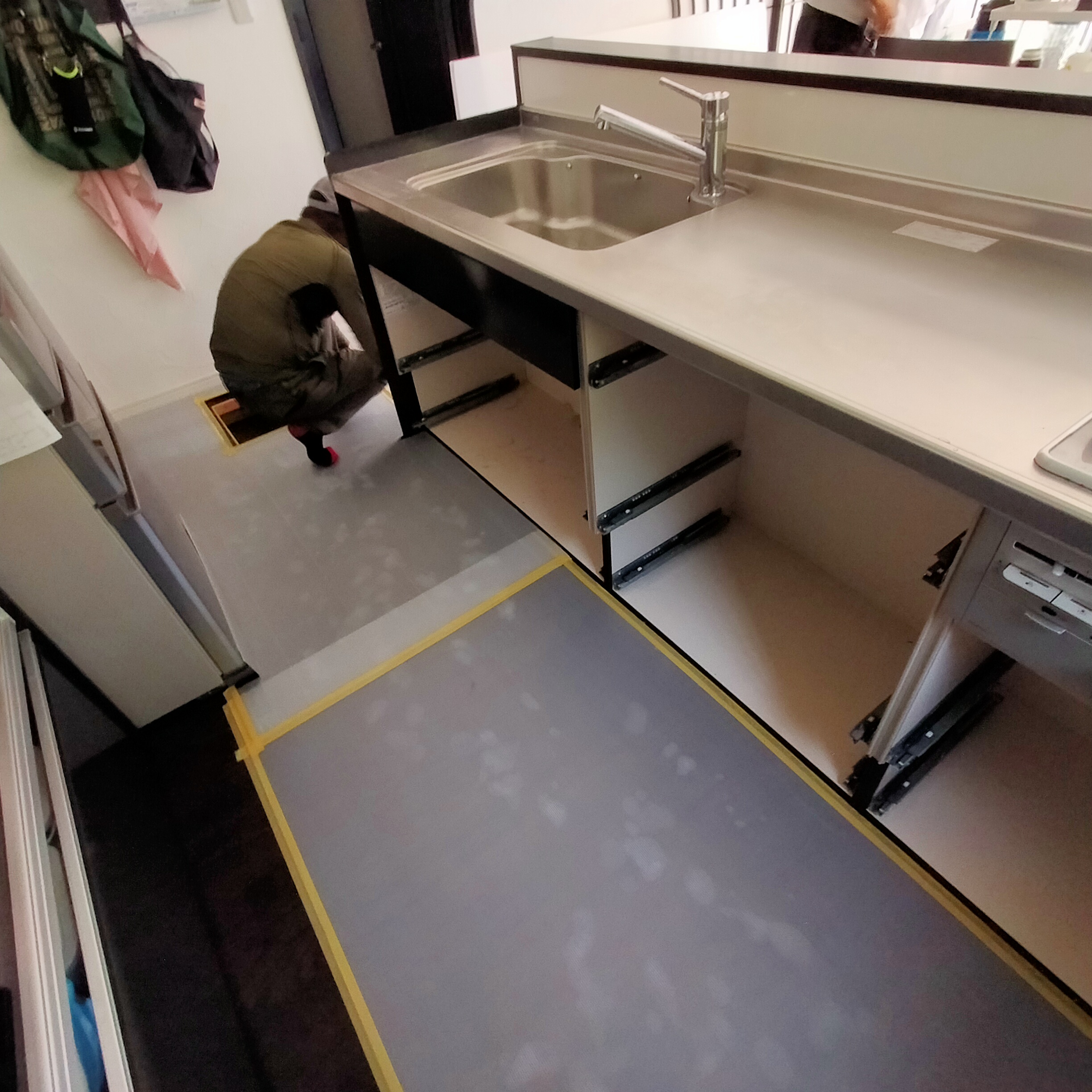 最初にすべてのキャビネットを外し、給排水の配管や電源の配線工事を行いました。