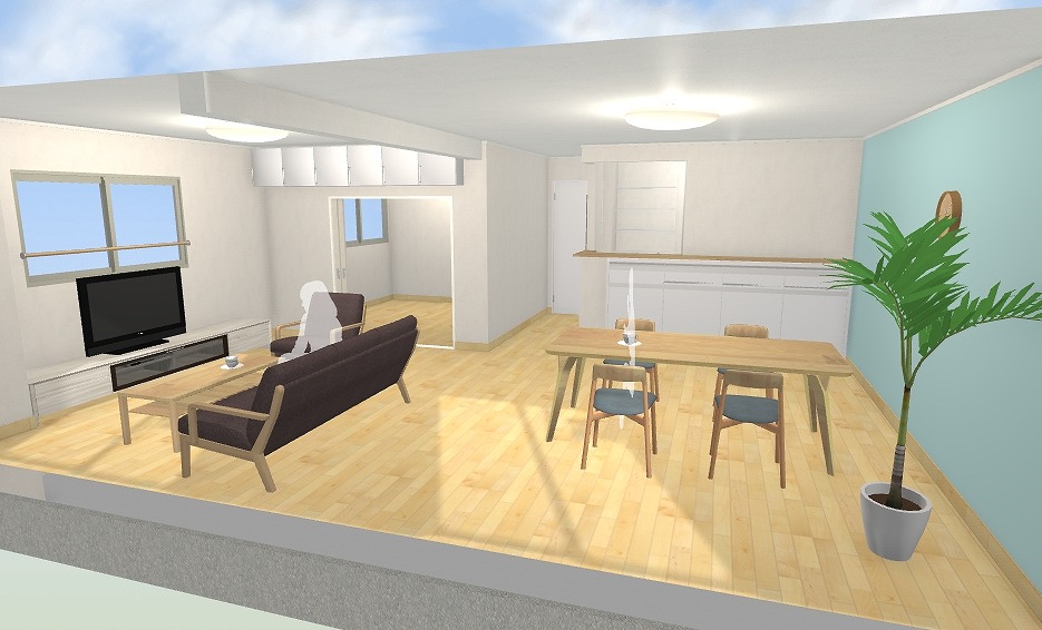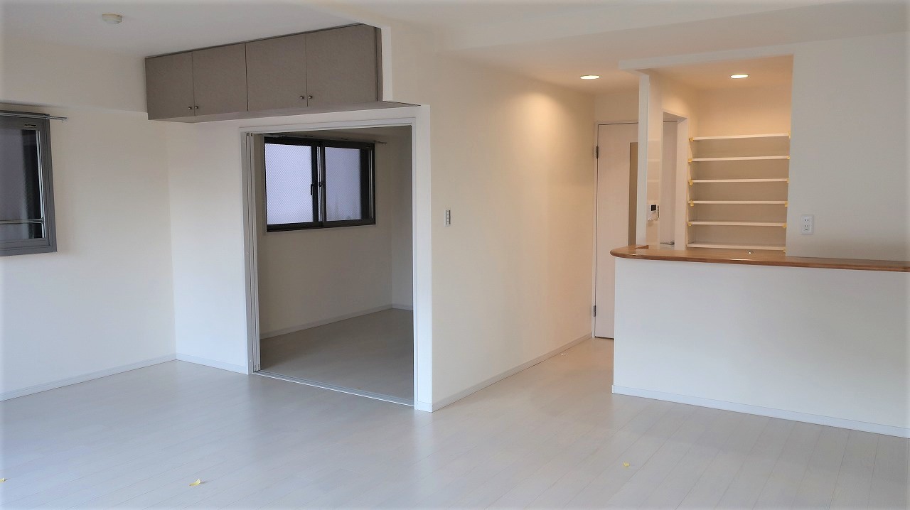 LDKと隣接するお部屋は間仕切りを撤去し、キッチン前の開口も天井近くまで広げて開放的な空間になりました!