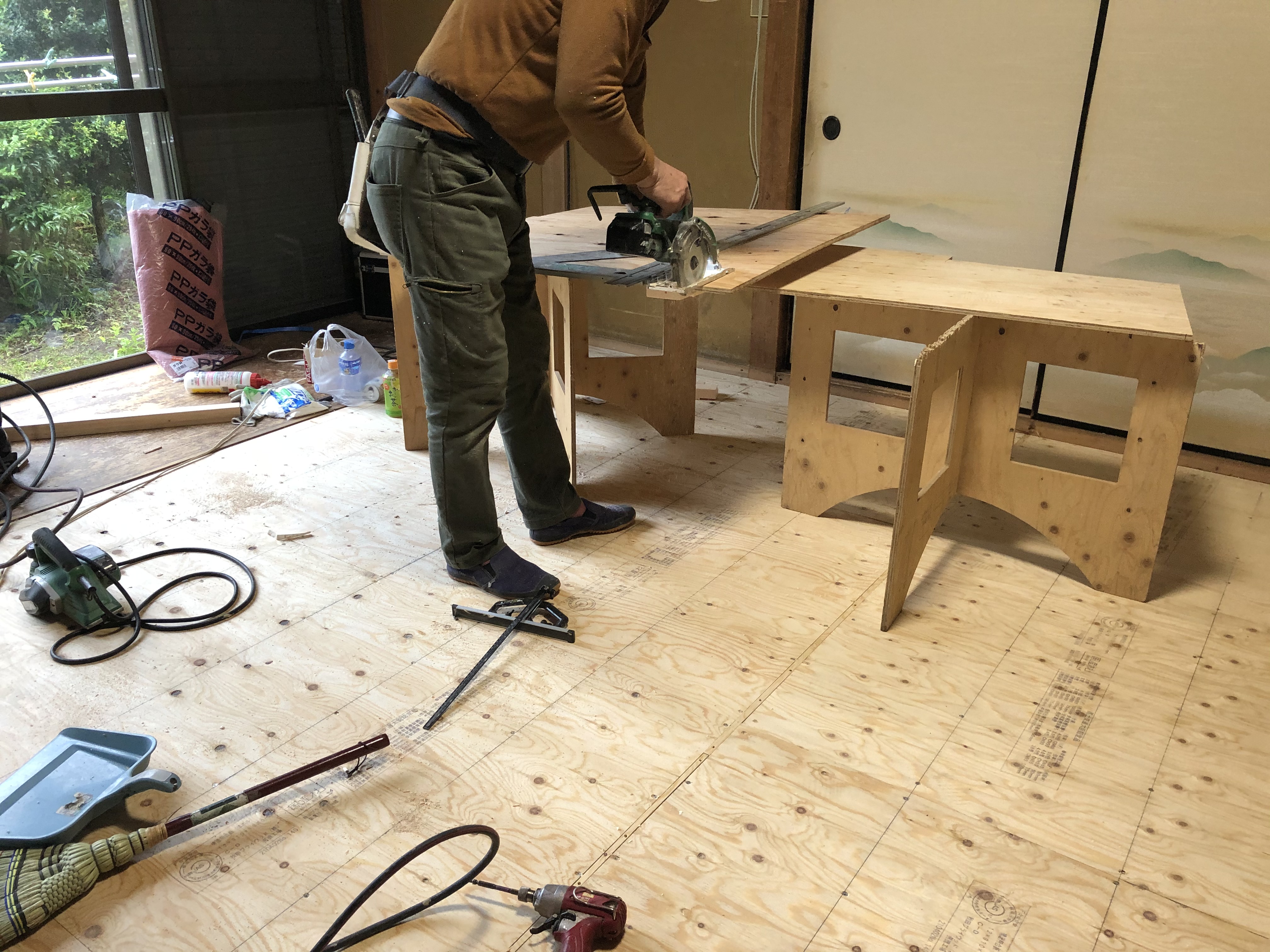 床下に断熱材を入れ、構造用合板を下貼りしているところです。