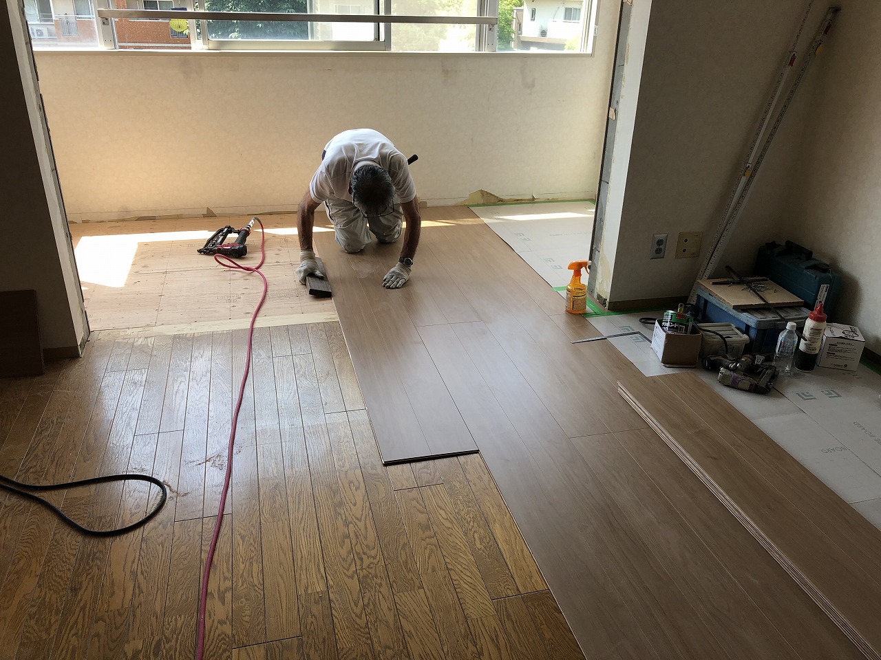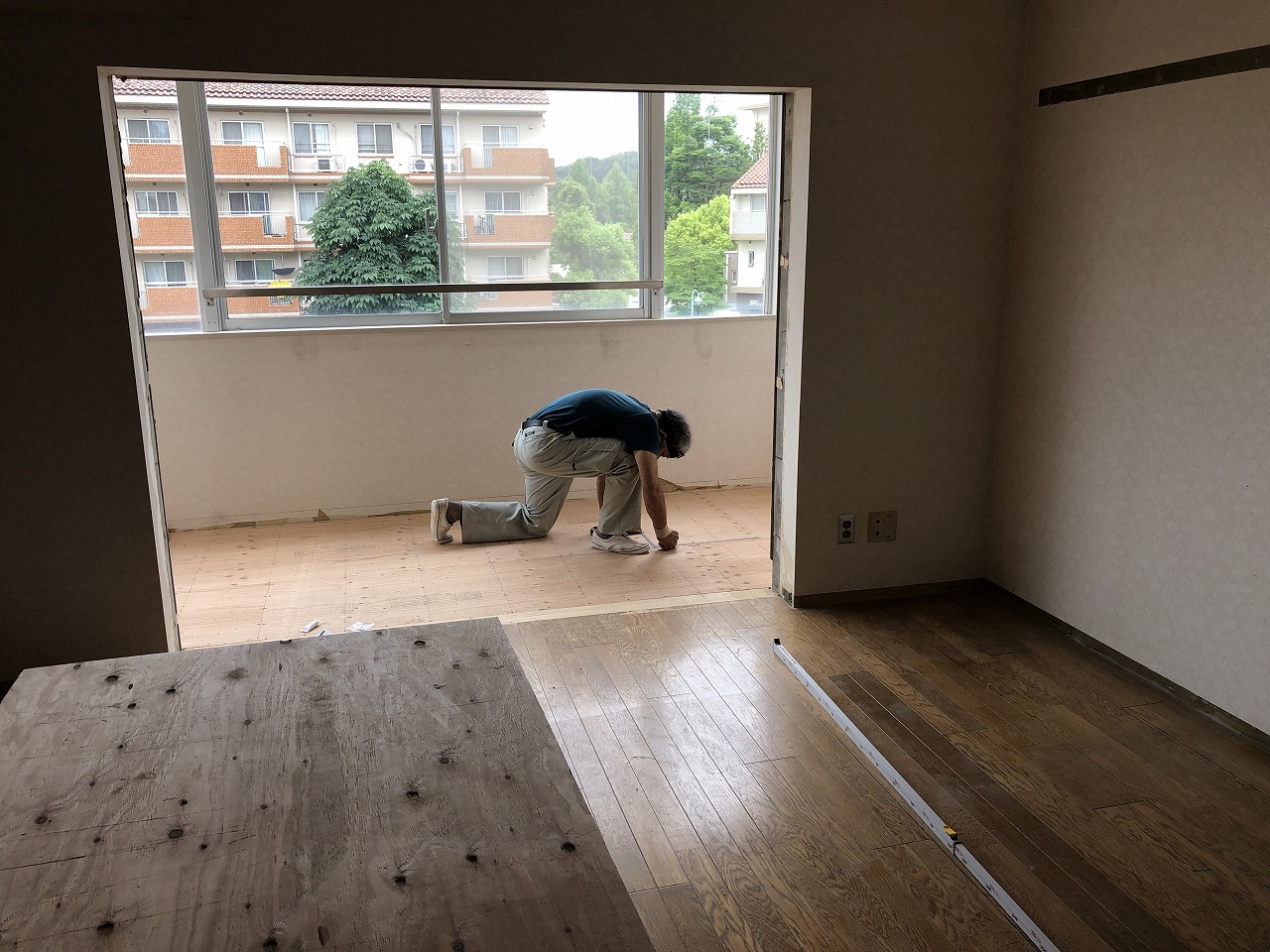 大工さんが床に下地を貼って段差を調整し、その上から仕上げのフローリングを貼っていきます。