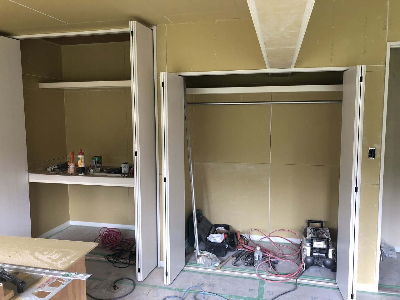 大工さんの工事は収納の中の造作が進んでいますが、こちらはお客様が収納したいものを細かく伺いながら収納内の棚板の枚数や棚板などを決めています。