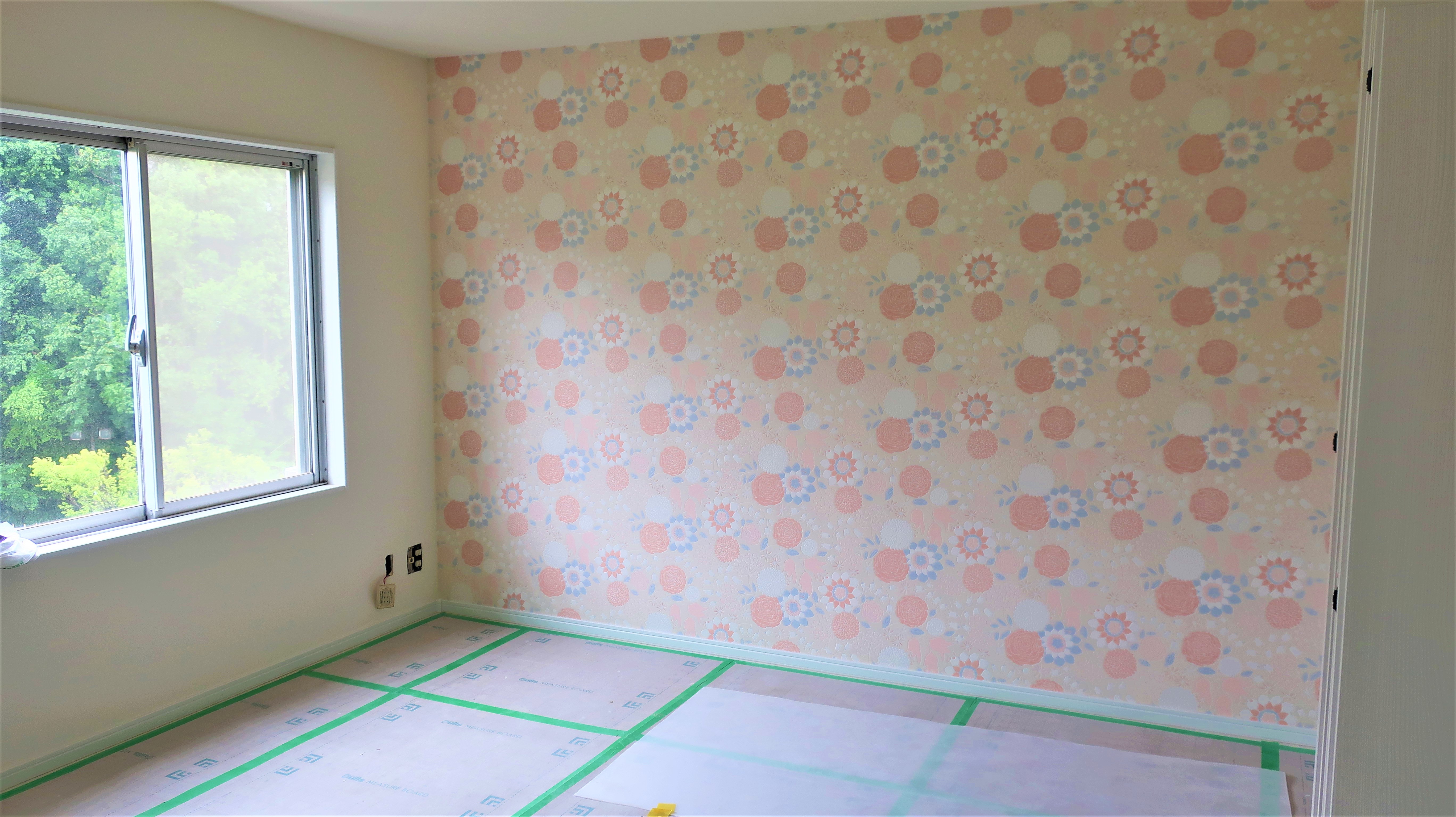 とっても素敵なのですが、厚みの薄い繊細なクロスということで、職人さんには丁寧に下地処理をして頂きとてもきれいに貼られていました!