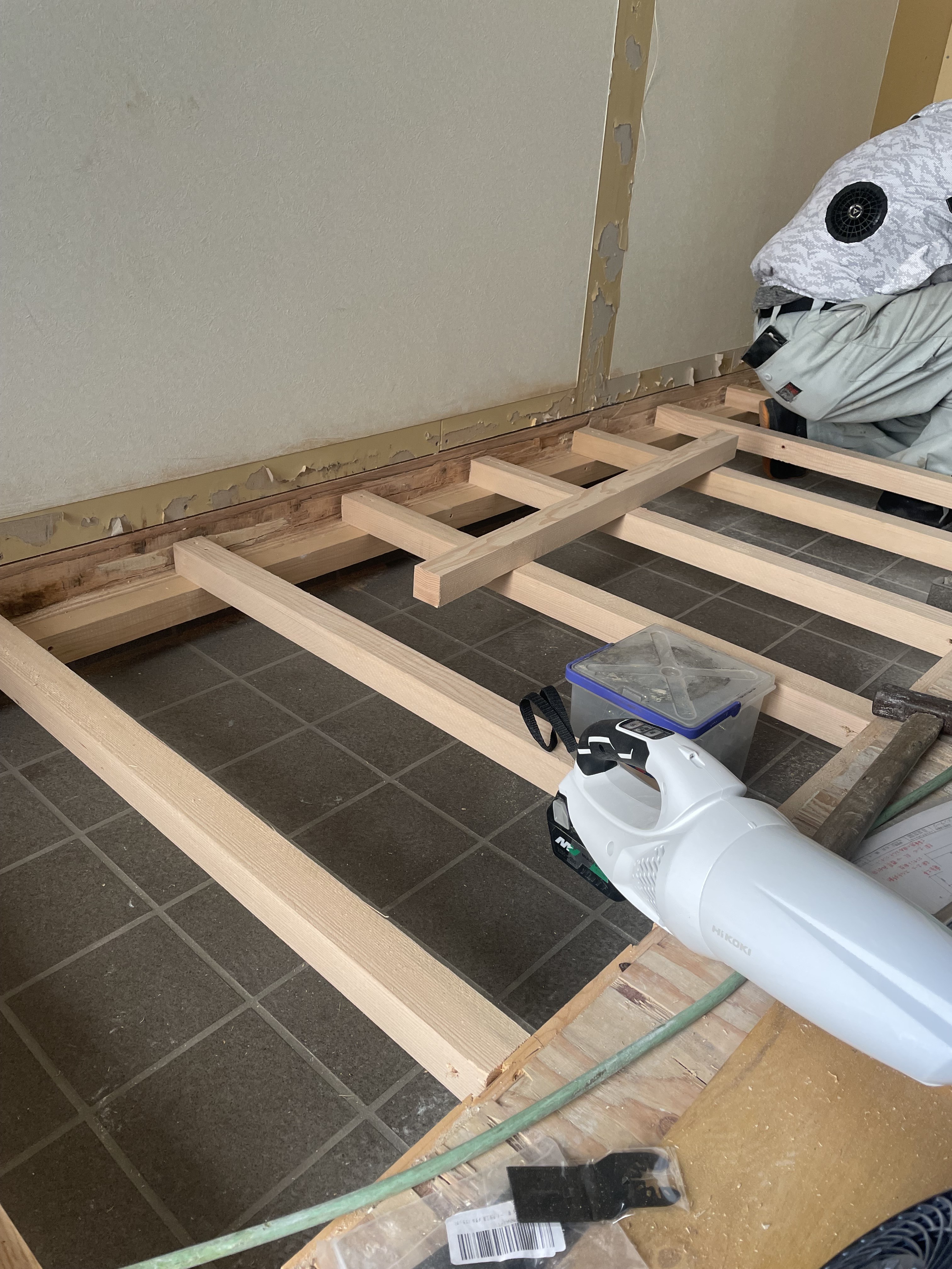 玄関土間に根太を組み、床を貼延ばしていきます。