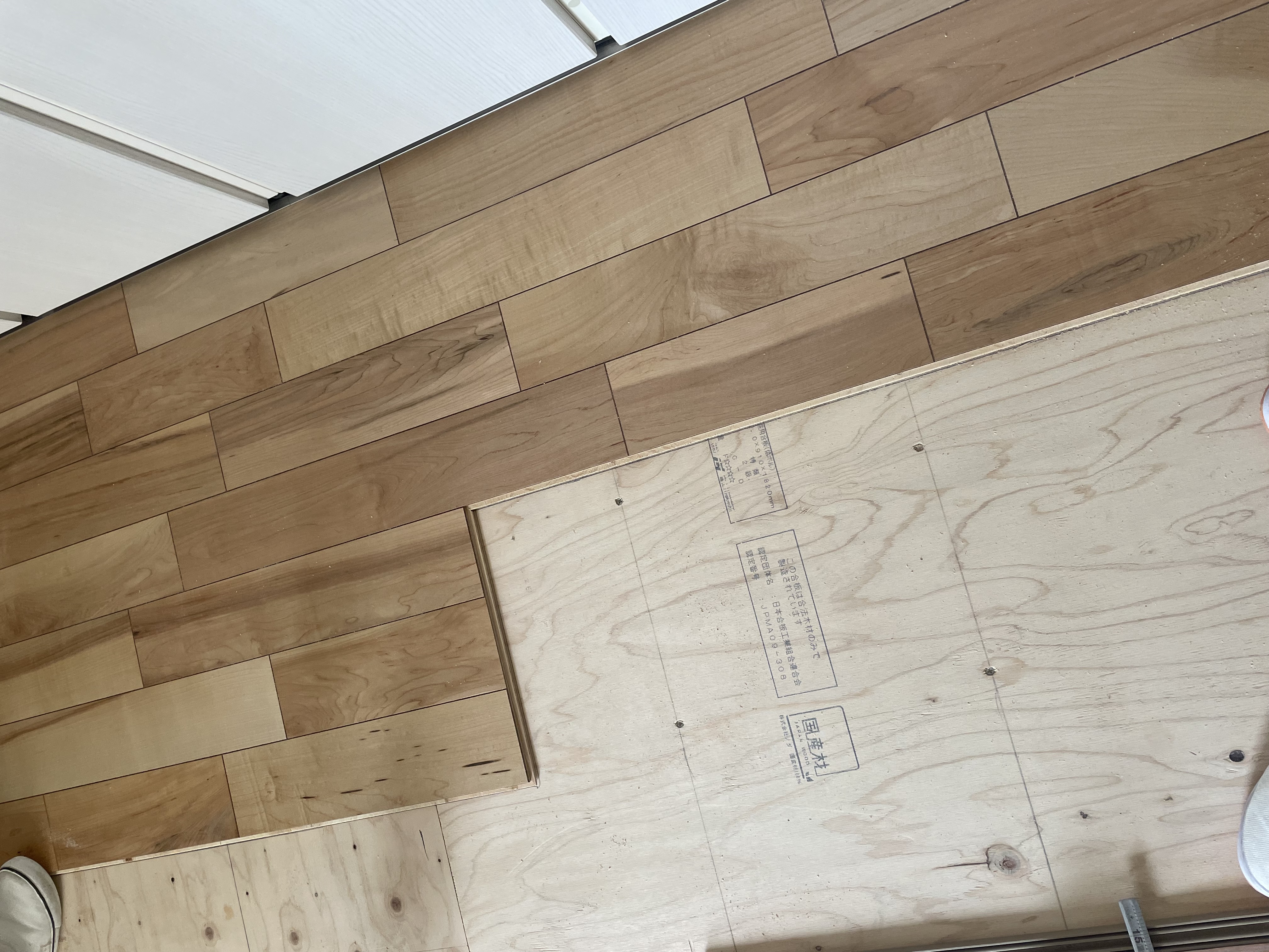 構造用合板で下地を作った上に、新しいフローリングを貼って行きます。
