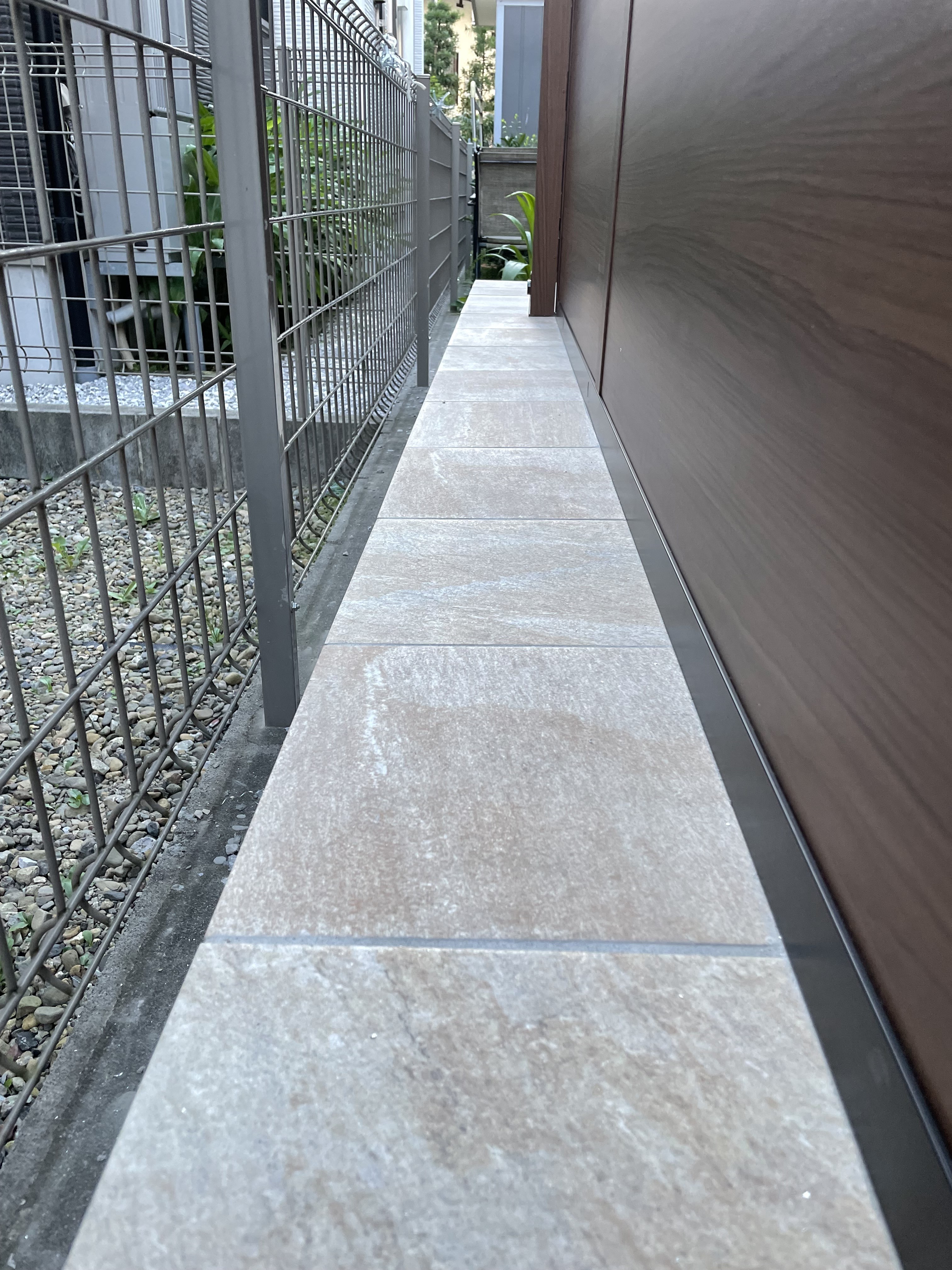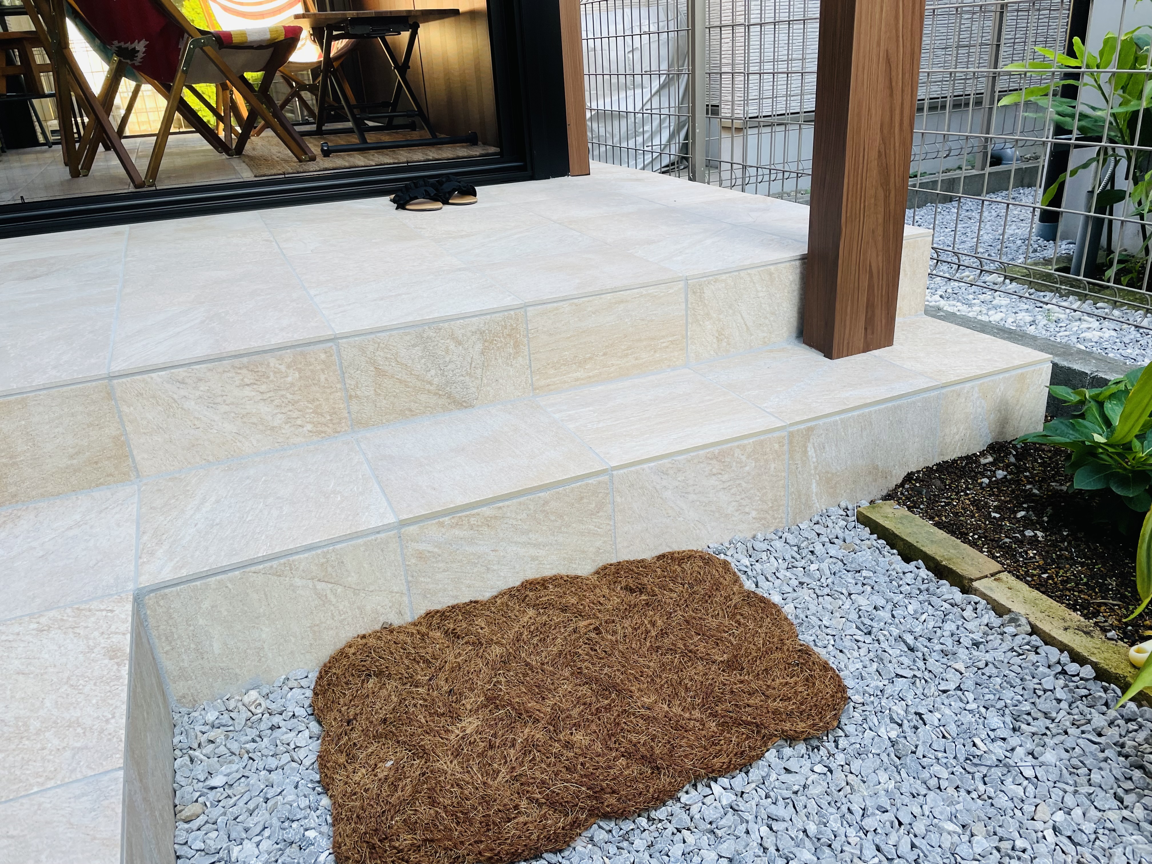 サンルームの床はリビングの床の高さに合わて上げたので、庭側にはタイル貼りの階段を設置しました。