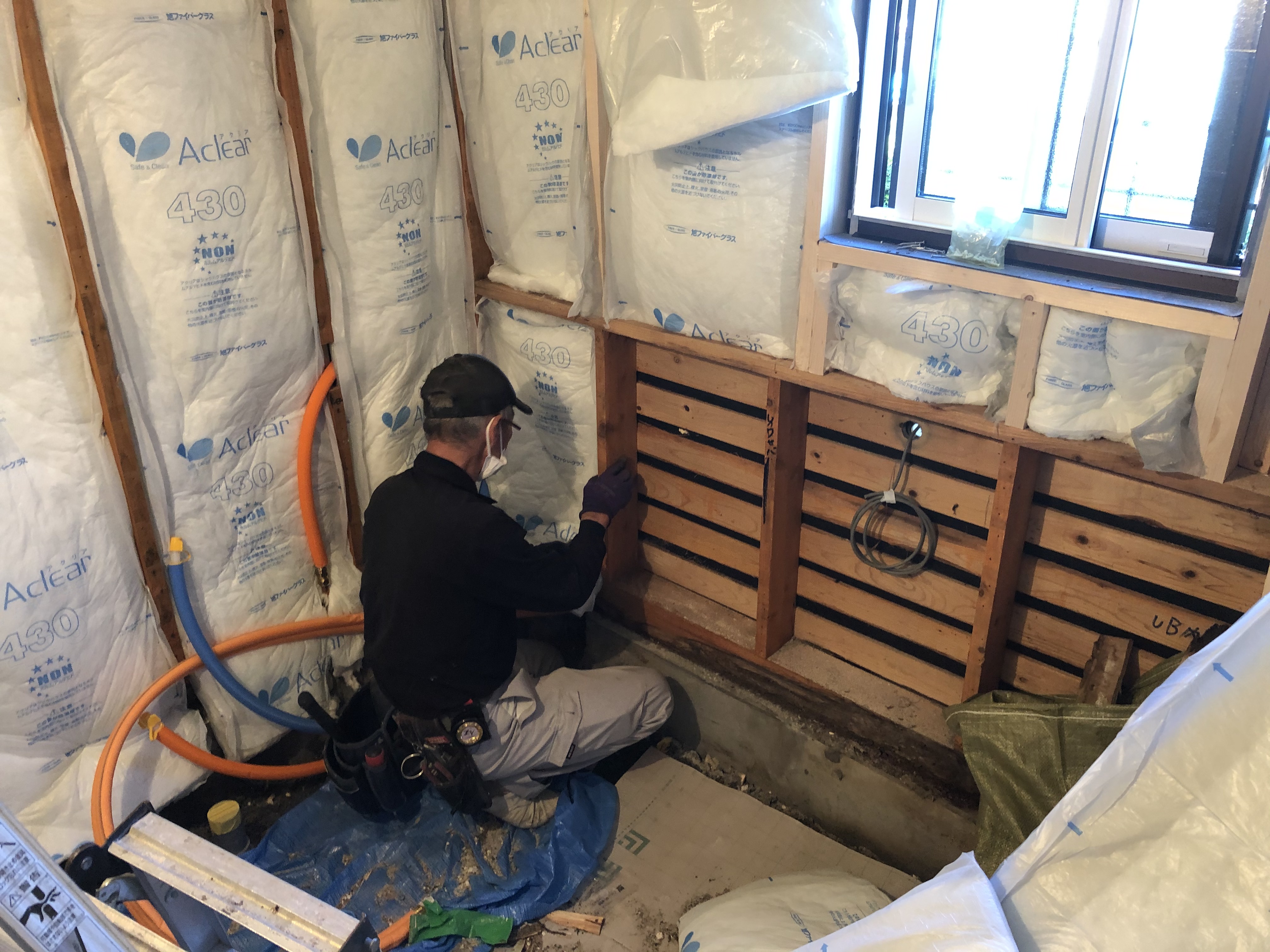 浴室の外壁廻りには、断熱材を丁寧に入れていきます