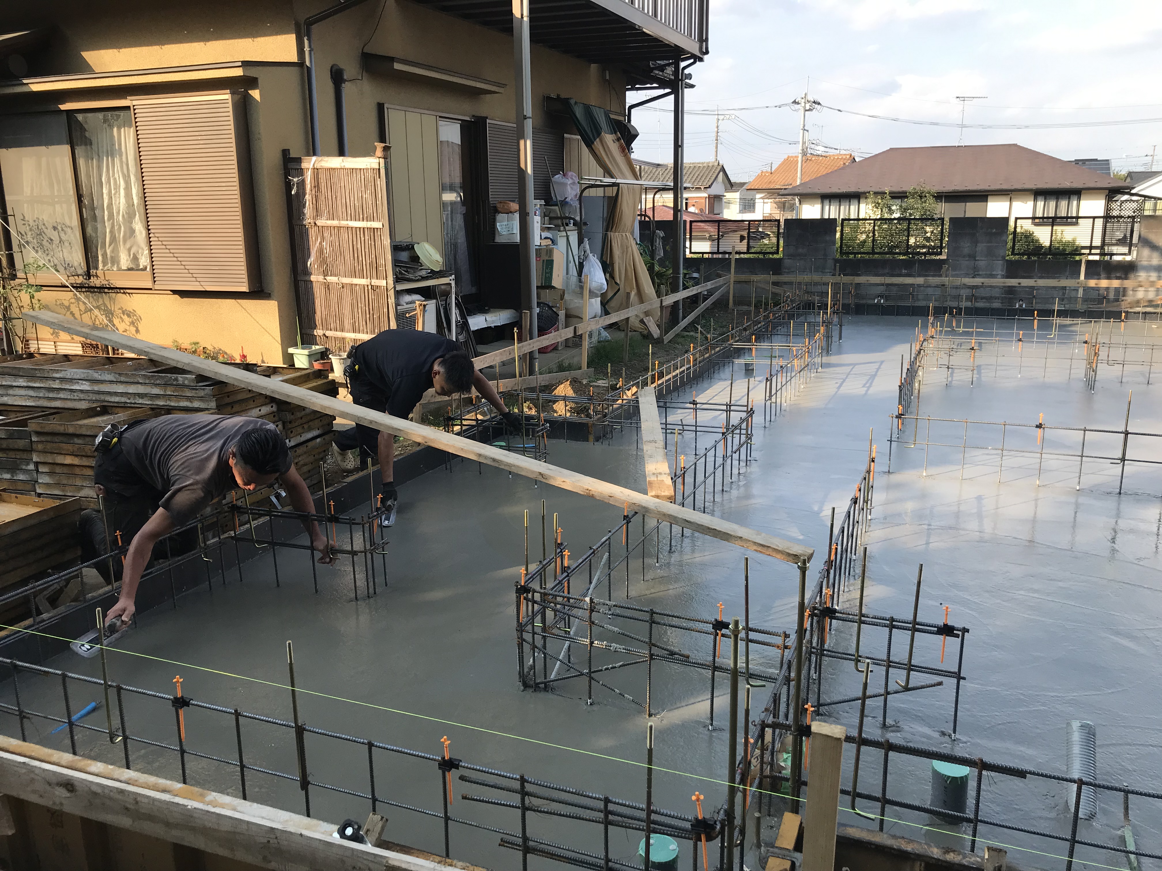 耐圧盤にコンクリートを打ち込んだら、職人さんがコテを使ってきれいにならしていきます。