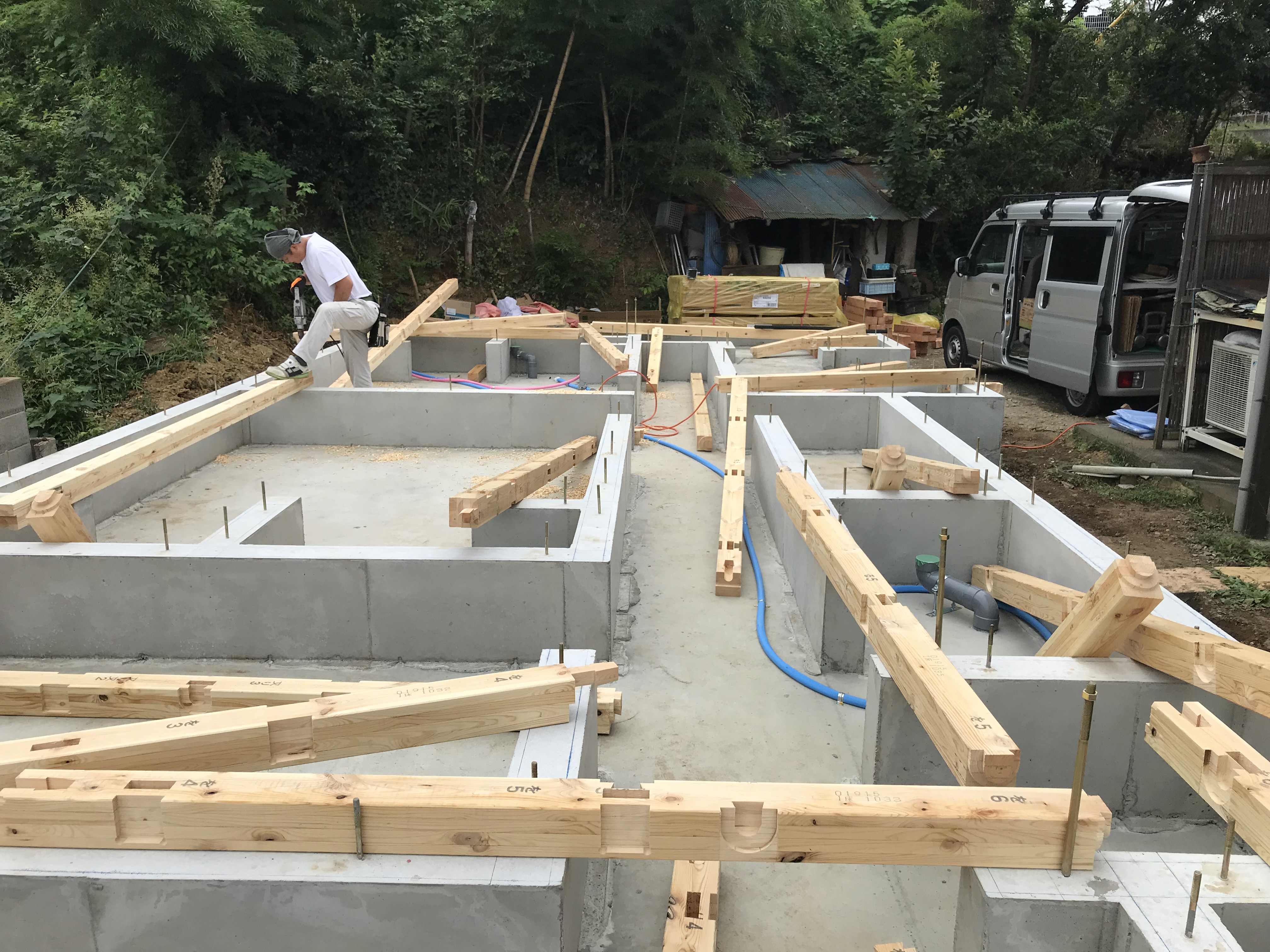 基礎の型枠が外れる頃、現場に木材が搬入され、いよいよ大工さんの出番です![]()