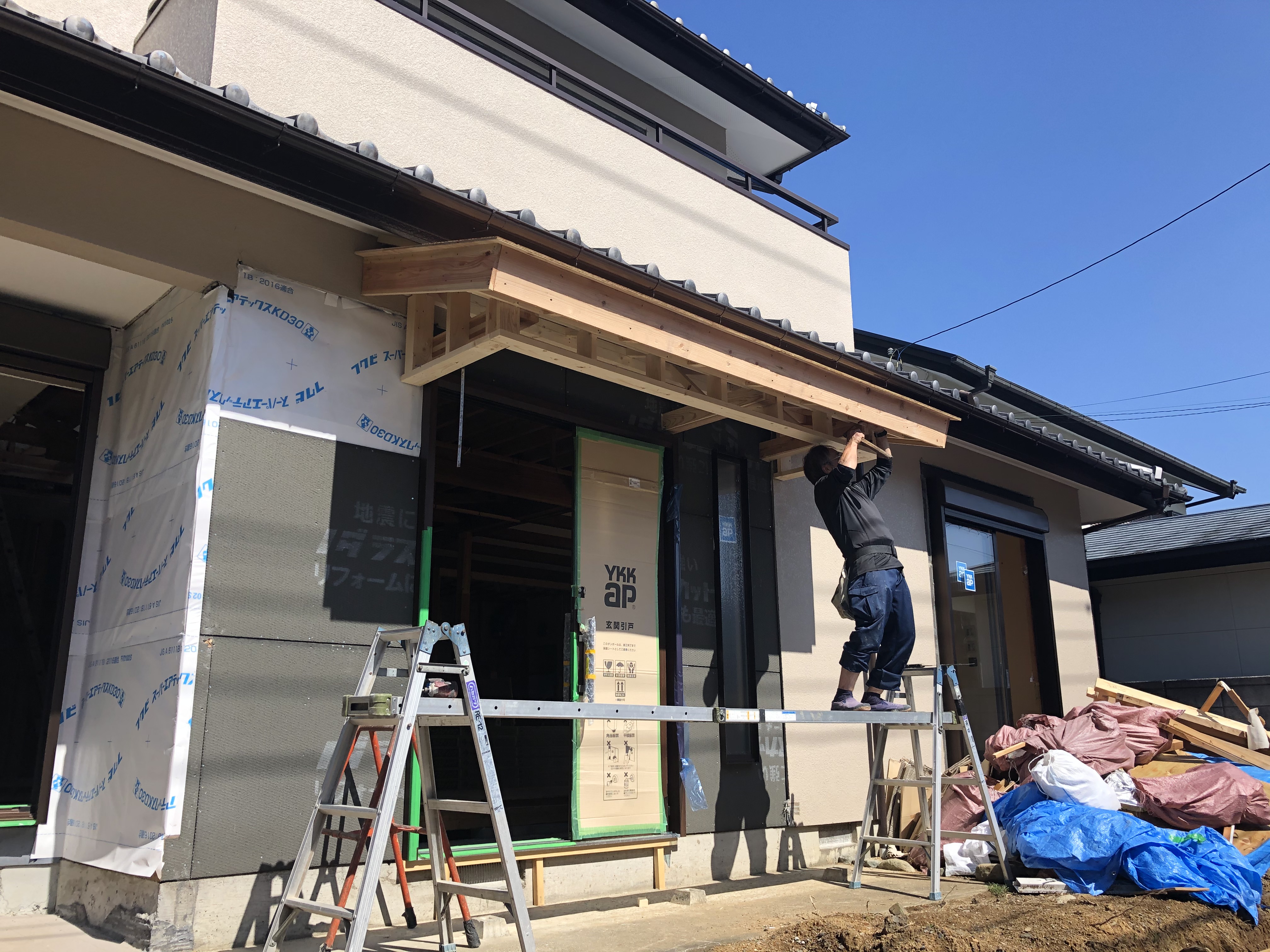 玄関の位置が建物の中央に変わったので、大工さんが新しく玄関屋根を作っているところです。