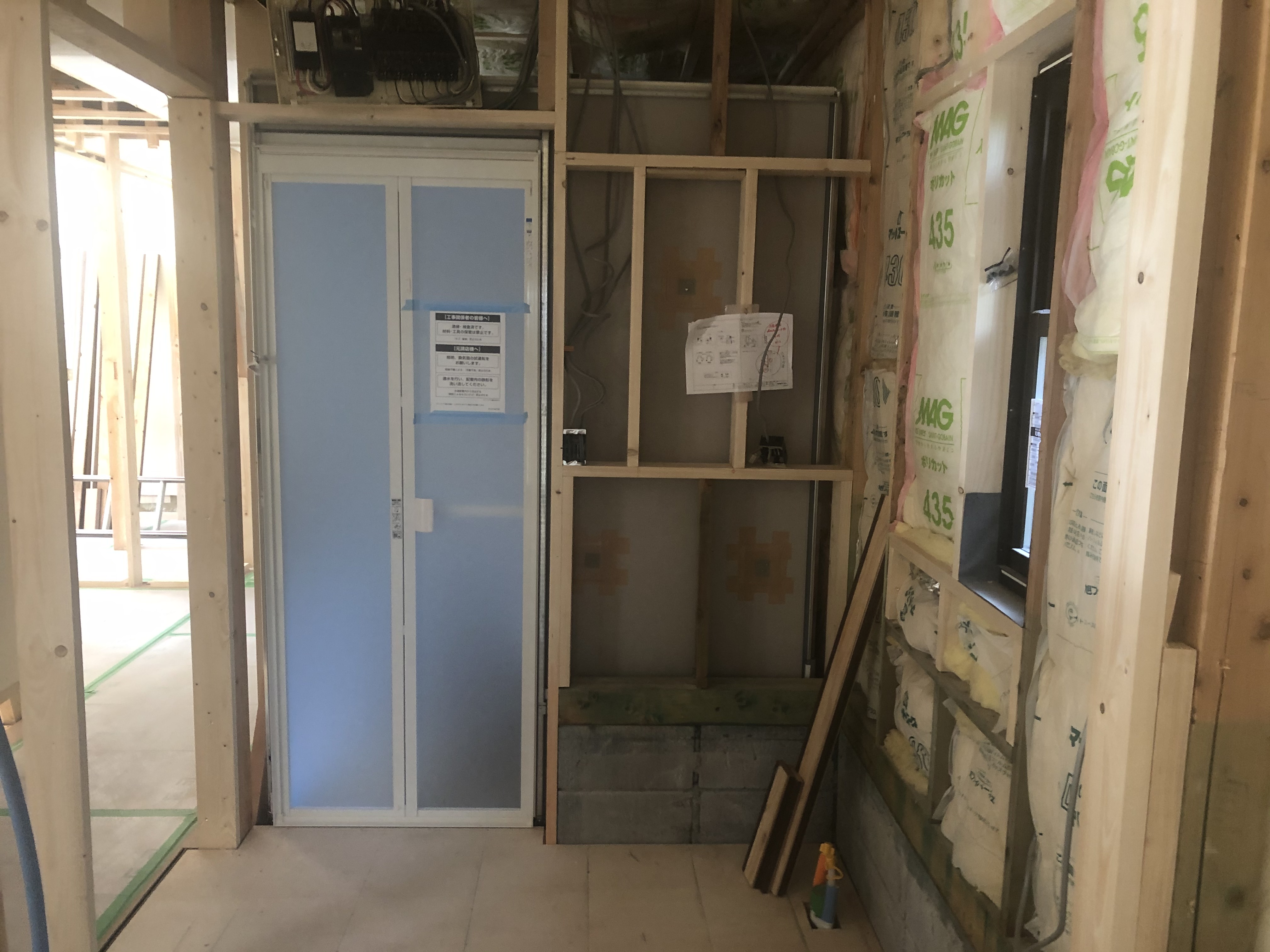 浴室のドアが設置され、ユニットバス工事が完成しました。