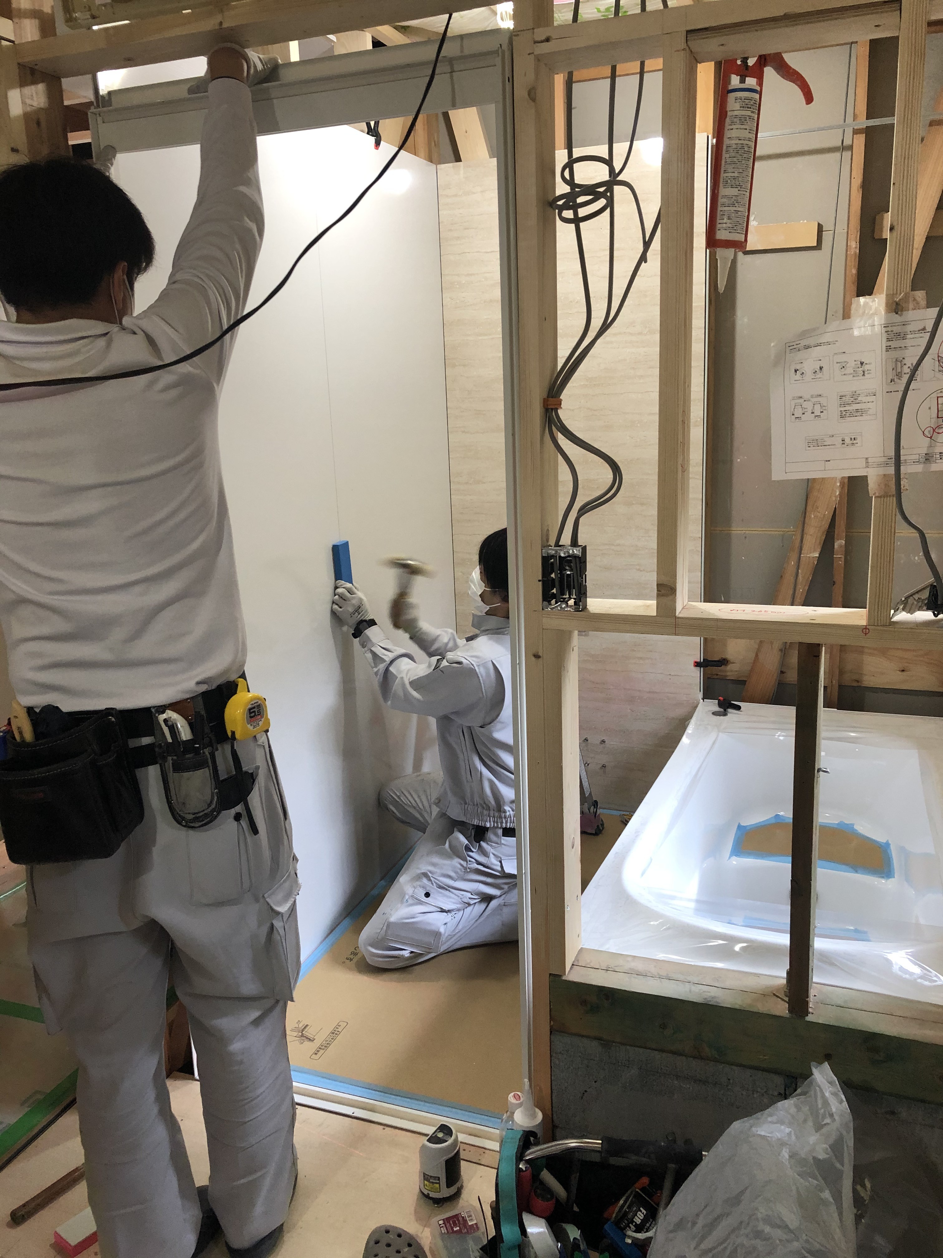 朝から職人さんが2人で手際よく浴室を組み立てて行きます。