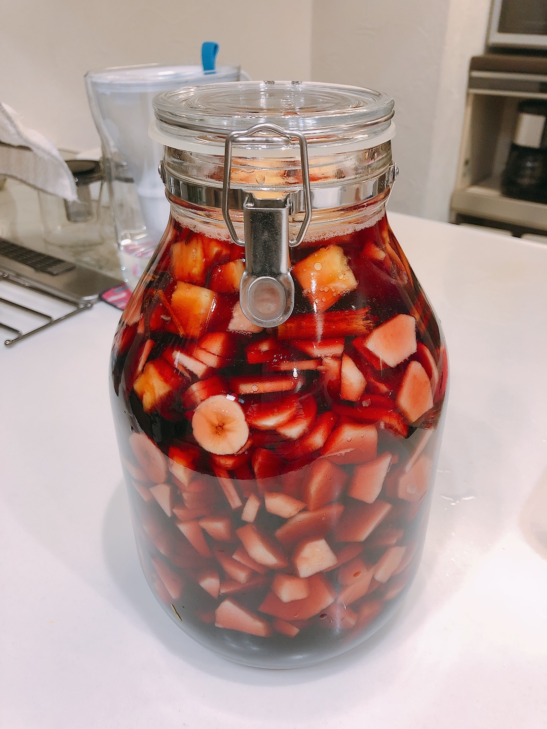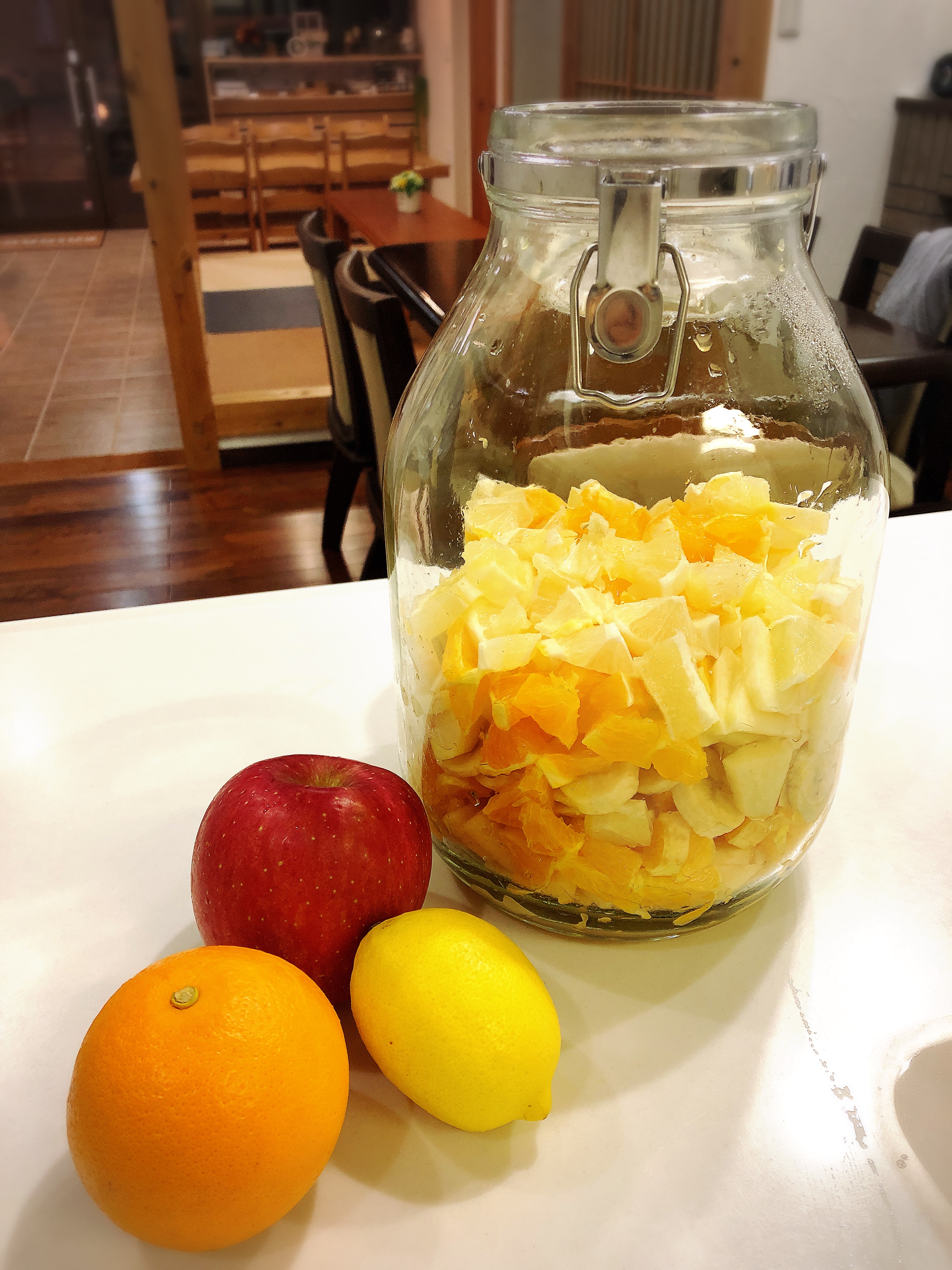 カットしたフルーツとスパイス、はちみつを瓶の中へ入れます![]()
