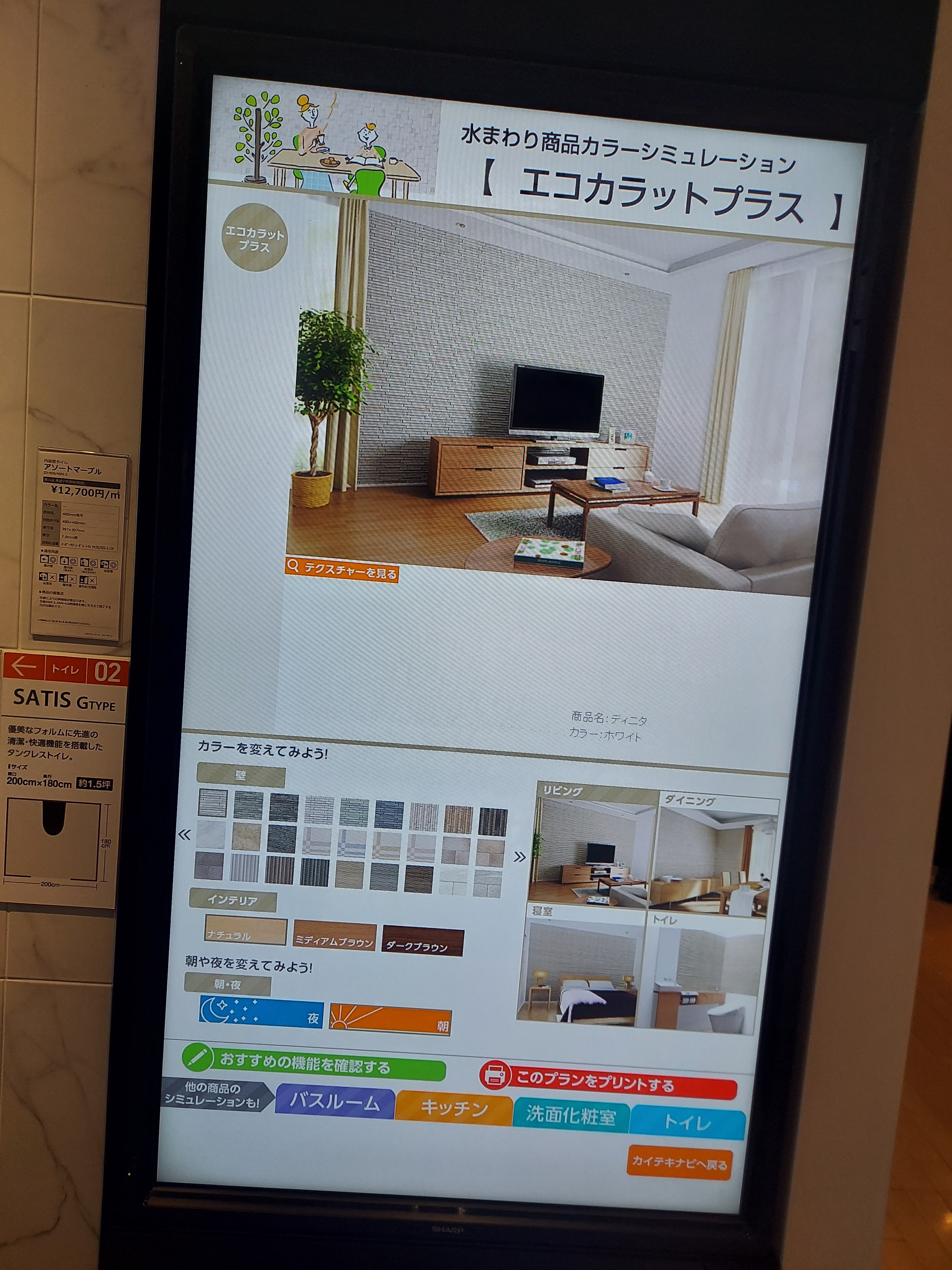リクシルさんはトイレや洗面なども多く展示しており、困ったときは、大型案内タッチパネルで調べられます![]()