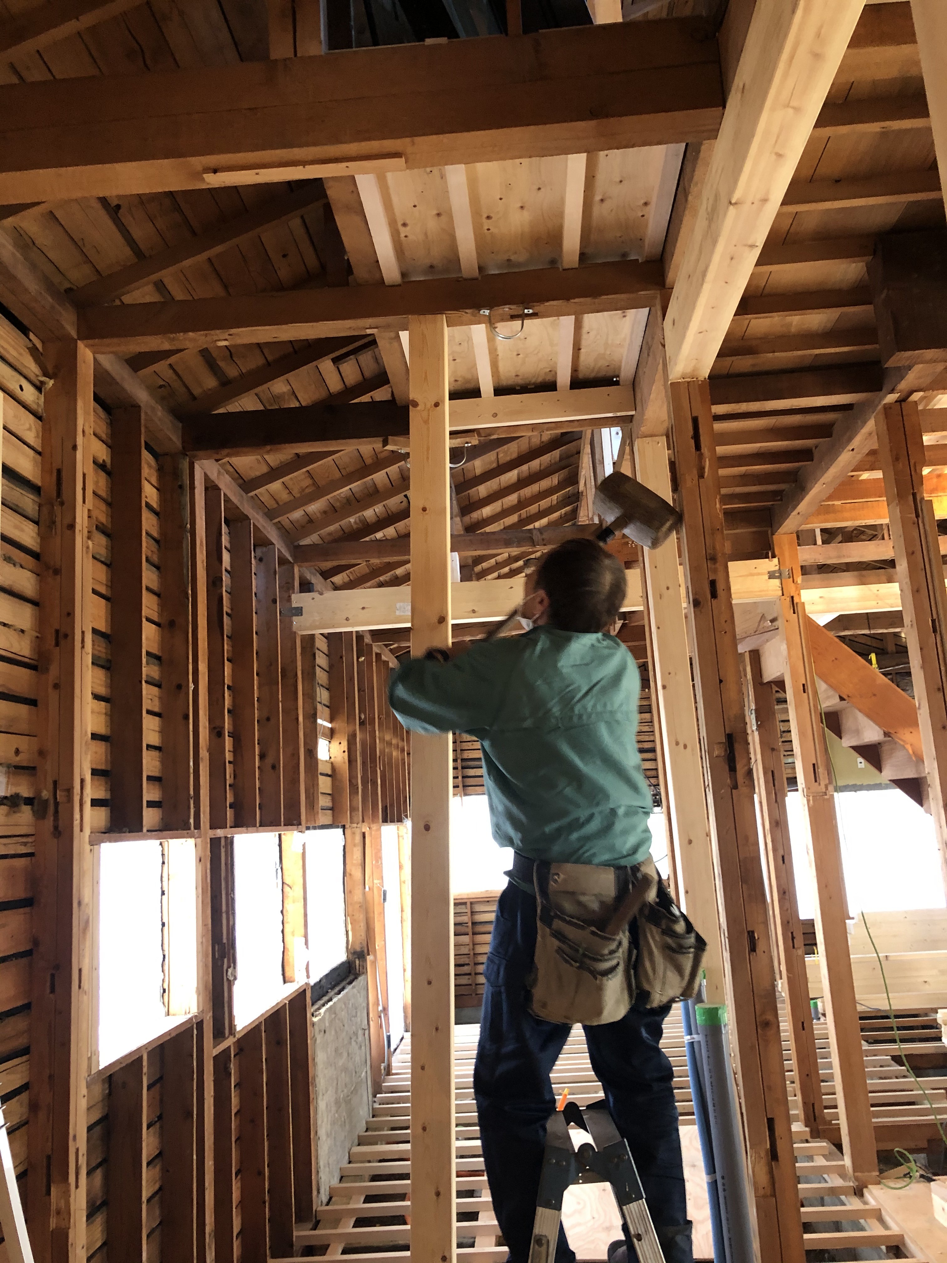 こちらは八王子市S様邸の全面リフォーム現場で、N大工さんが補強の柱を入れているところです。