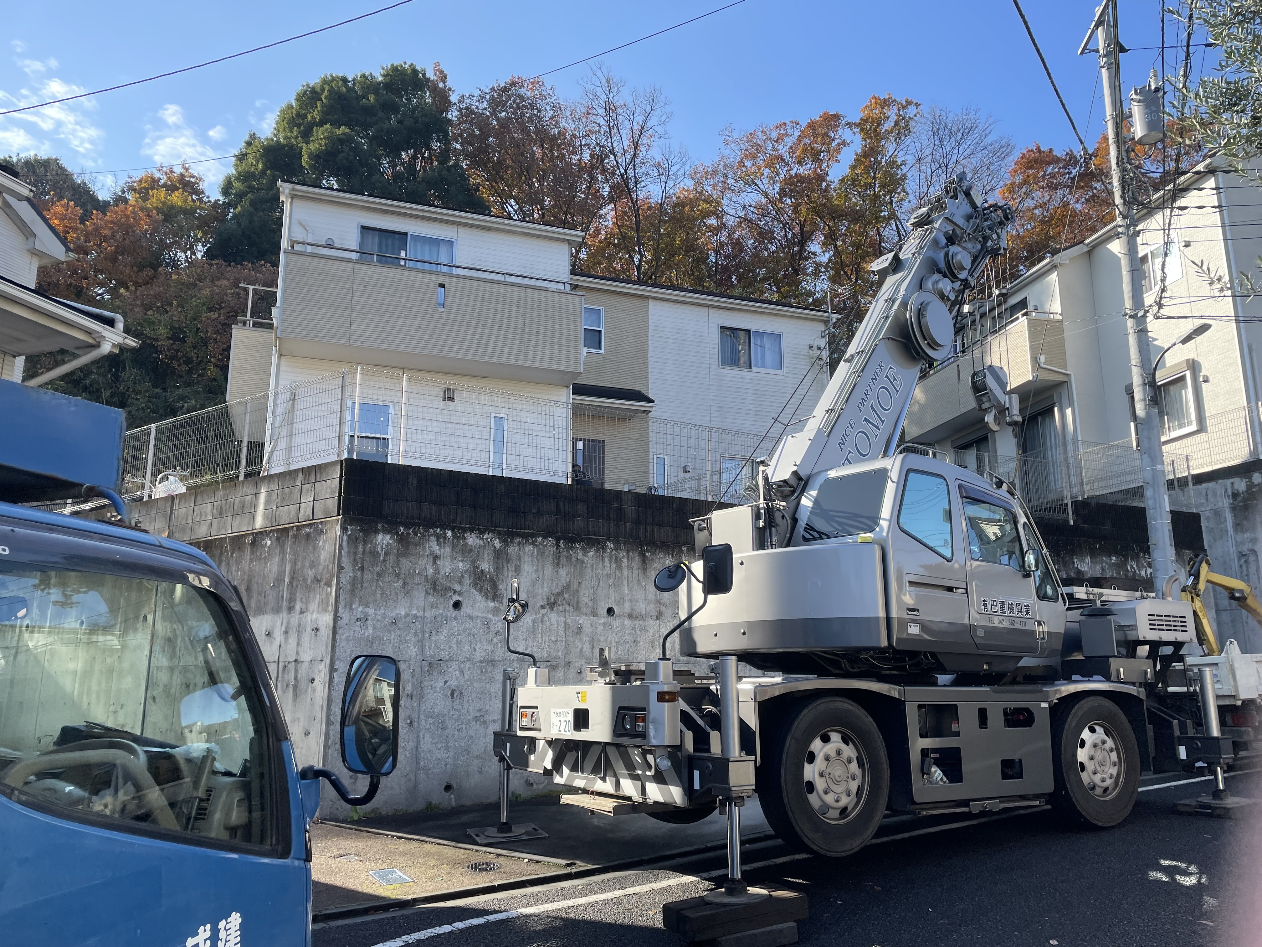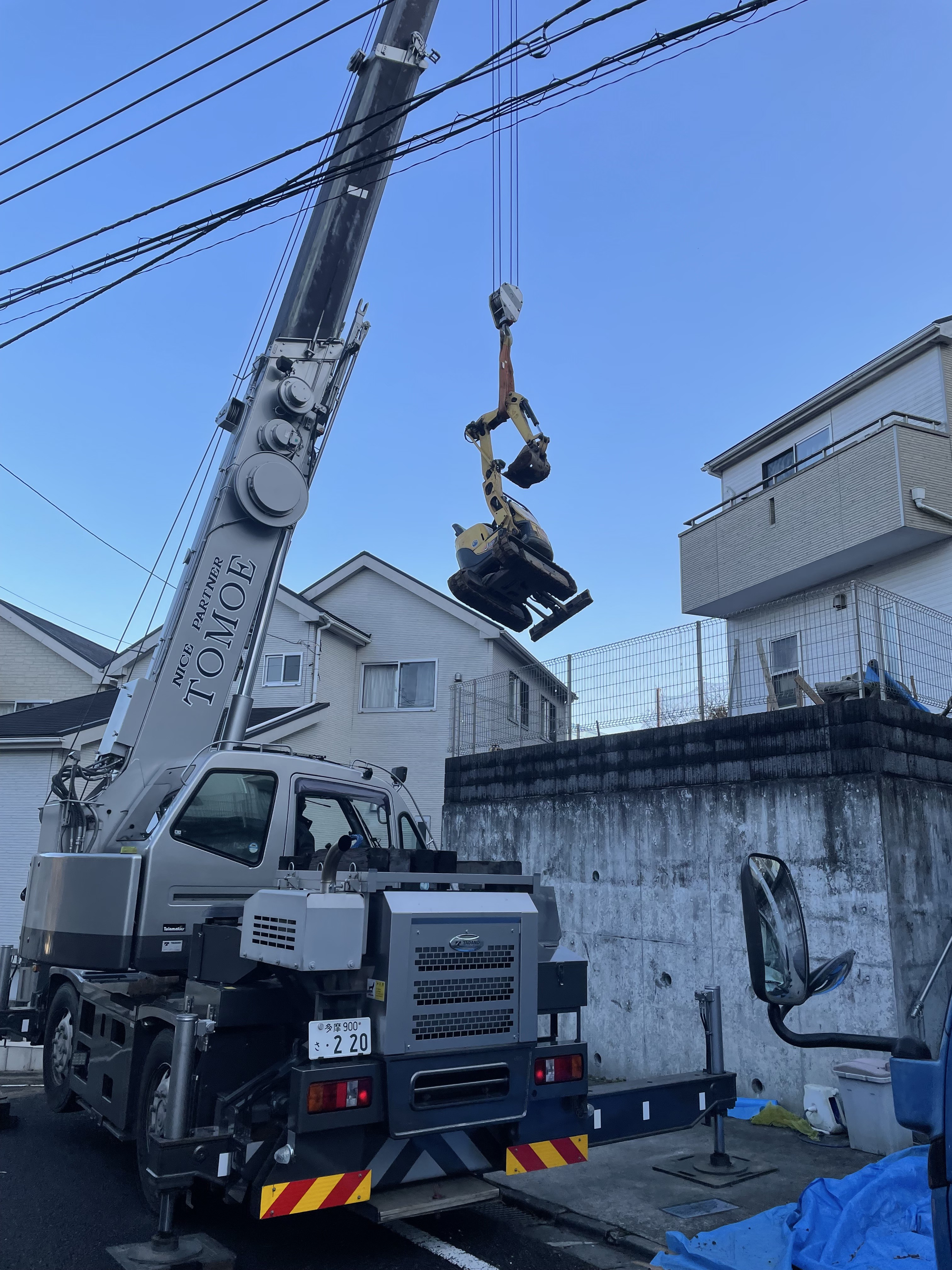 高台に位置するため階段では上れないので、重機で吊り上げました。
