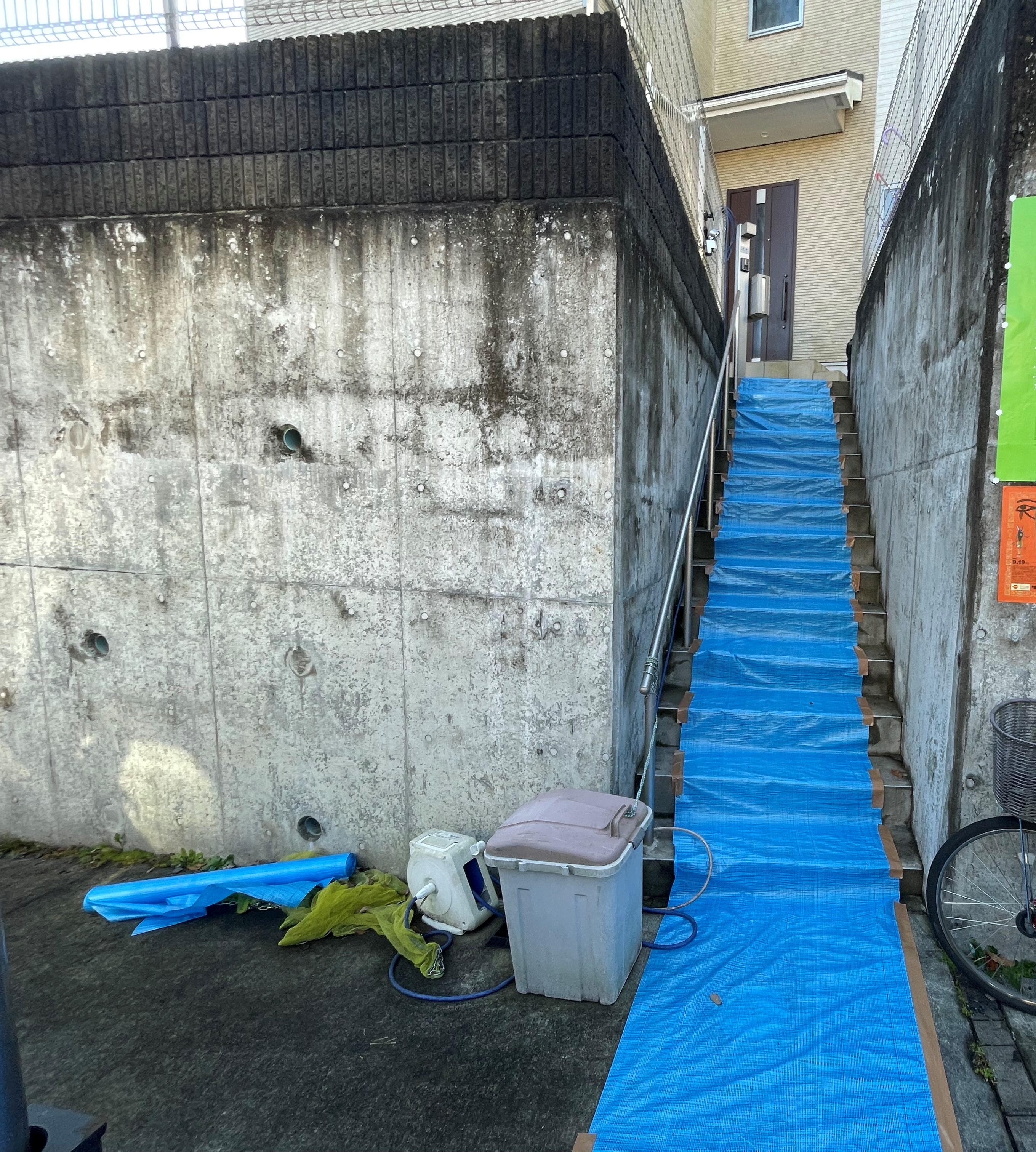 階段は人の出入りがあるため、ブルーシートで養生させて頂きました。