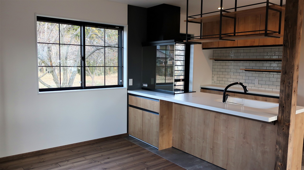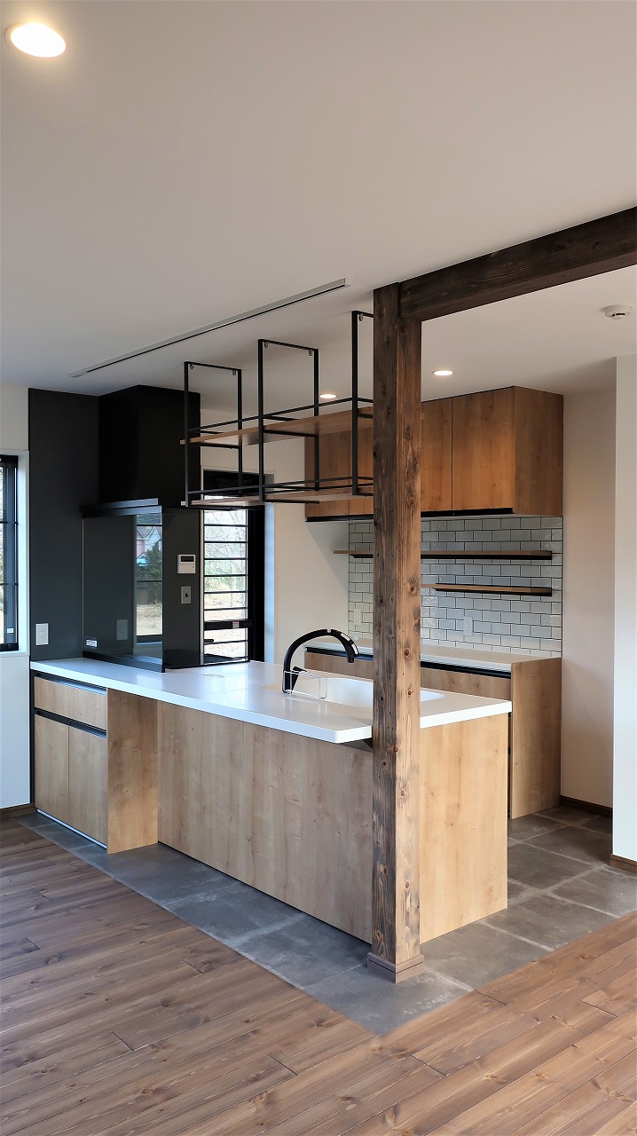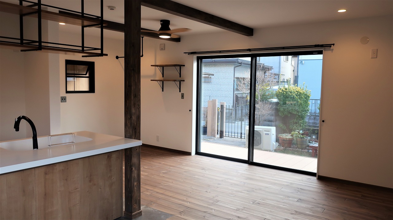 壁を取って開放的にし、化粧梁や無垢のフローリングとアイアンなどのブラックでメリハリのあるナチュラルなLDKに生まれ変わりました![]()
