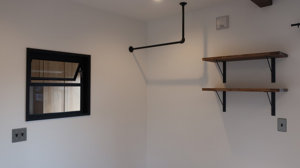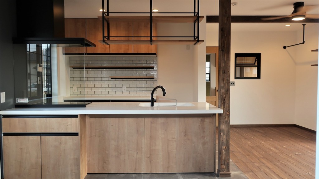 キッチンの上にはウッドワンの『テンツリ』。無垢材の棚板とアイアンの金物の組み合わせがとってもかっこいいです!