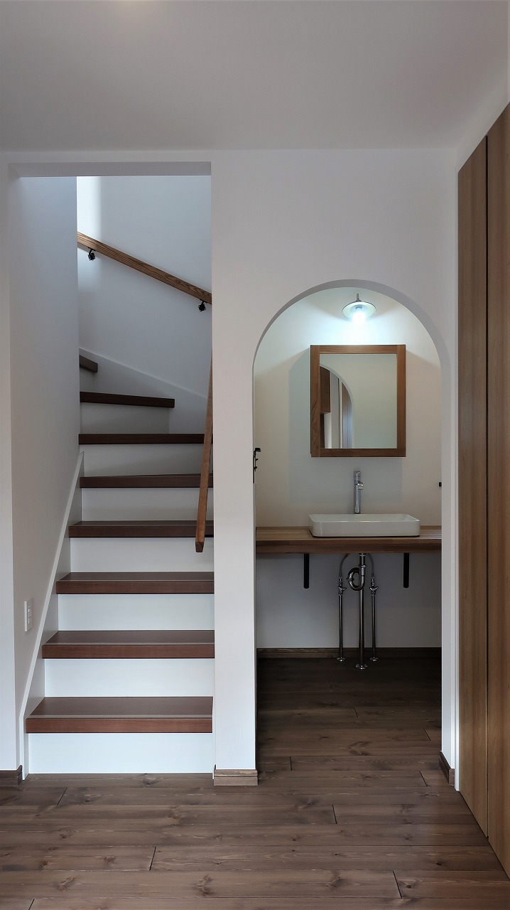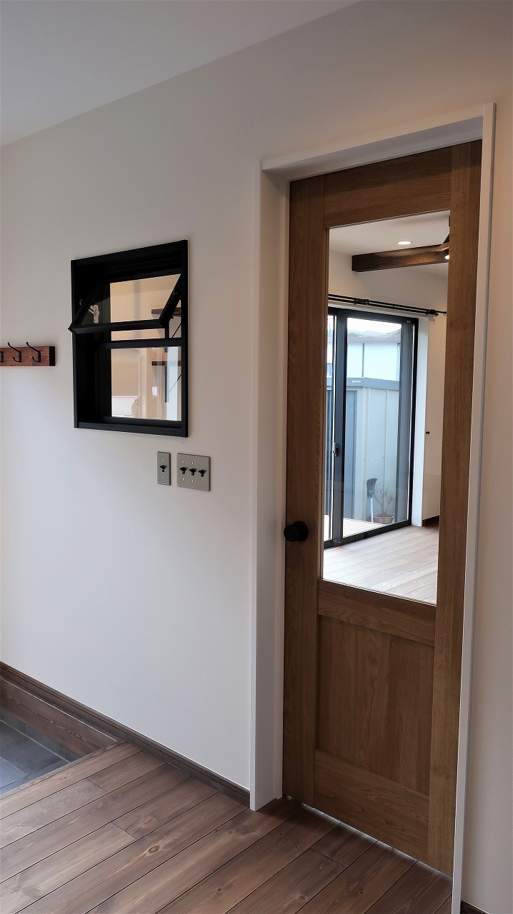 こちらは間取りは大きく変えずに床は無垢のフローリング、ドアや玄関収納はパナソニックの『ベリティスクラフトレーベル』、リビングとの間仕切り壁には室内窓を設置しました♪