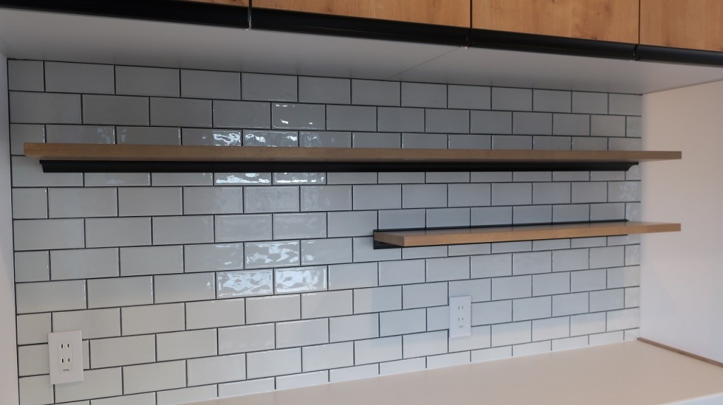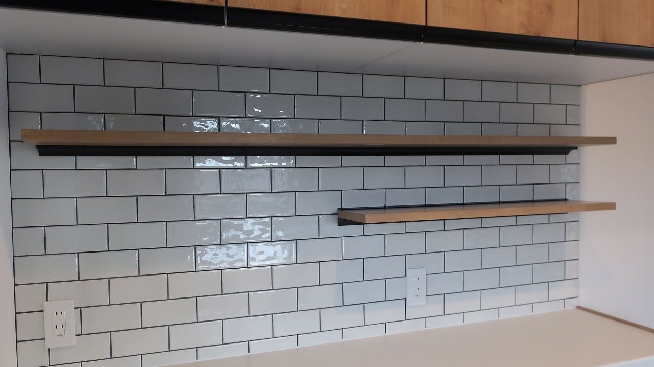 キッチンの背面キャビネットのカウンター上には、白いサブウェイタイルを貼ってスタイリッシュに![]()