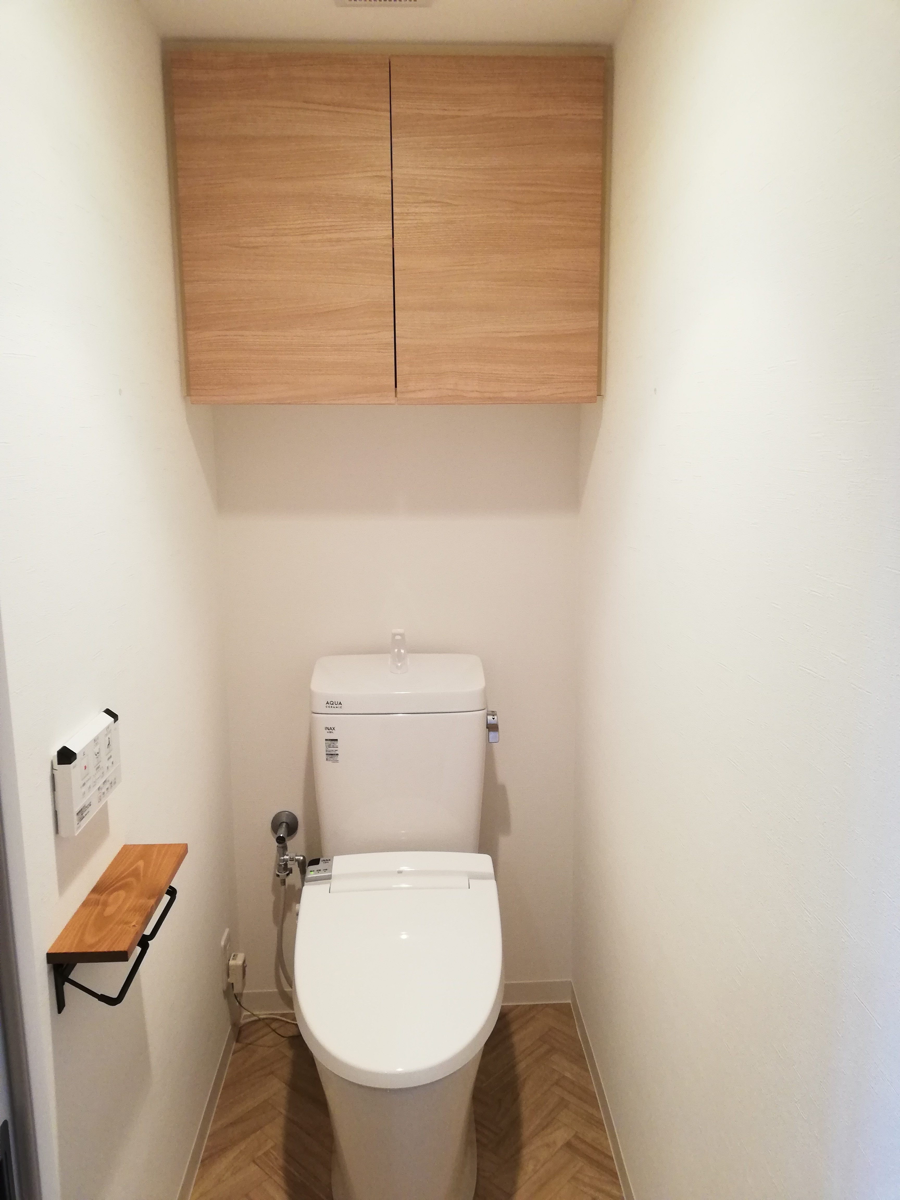 トイレは既存の吊戸棚をシートでお化粧直しして、