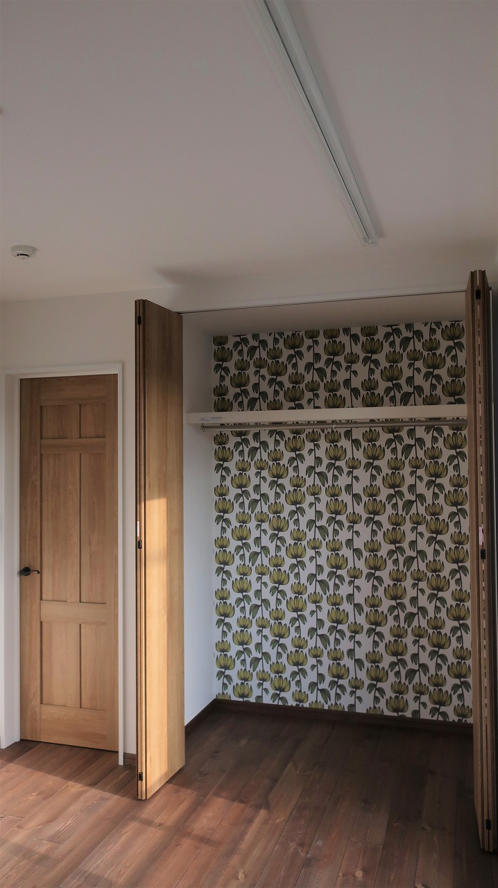また壁紙は遊び心を加えて、クローゼット収納の中に花柄やへリンボンの板貼りのようなデザインクロスを採用しました