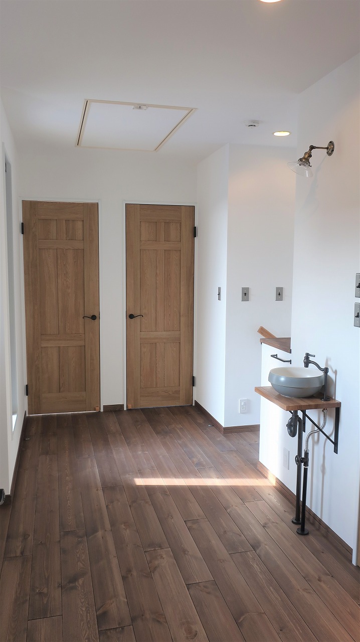 反対側はご夫婦の寝室と家事室があります。こちらは落ち着いた木調の扉で床との相性も良いですね♪