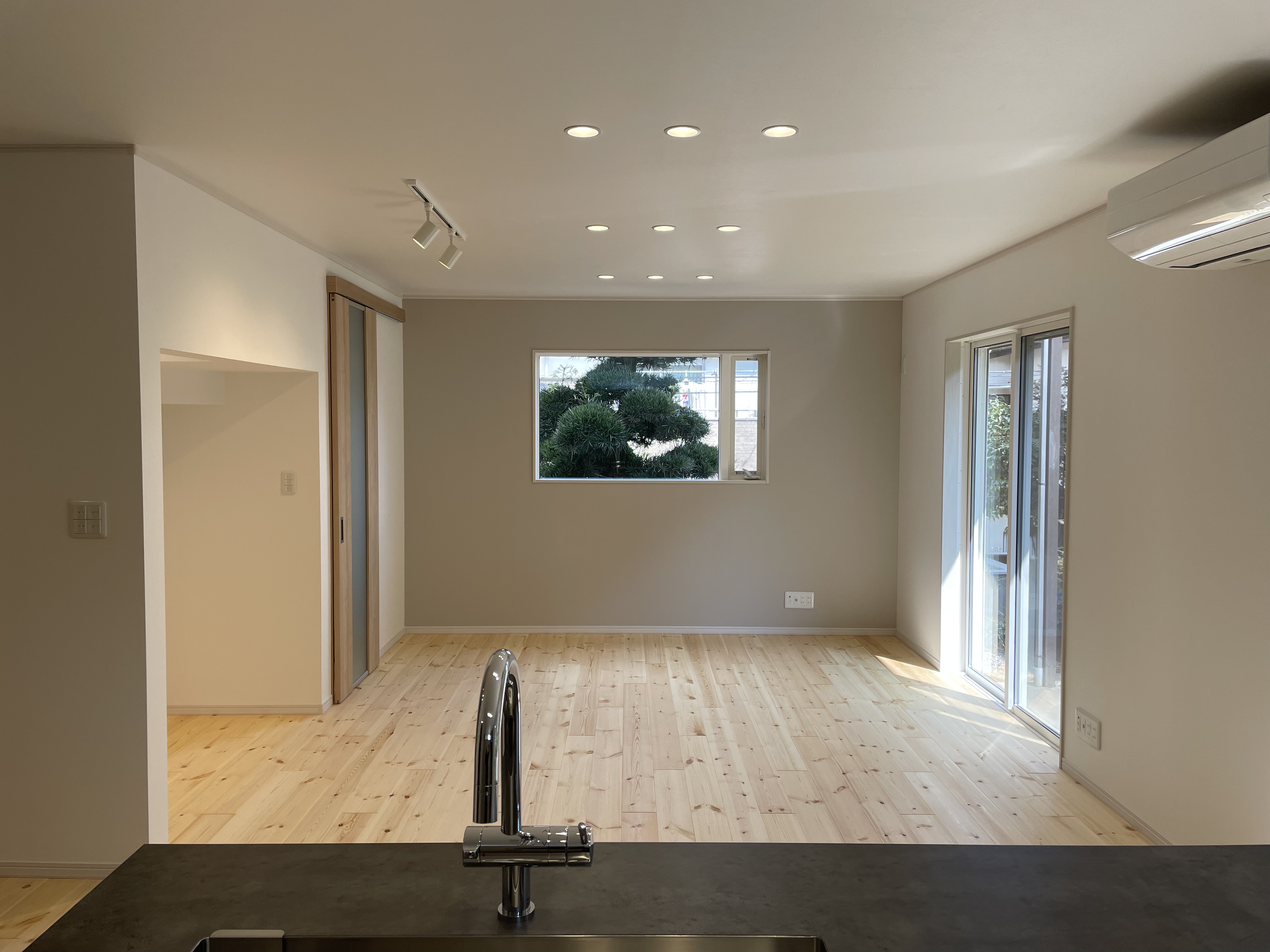 キッチンに立ってリビングを見ると絵画のような松の木が見えます