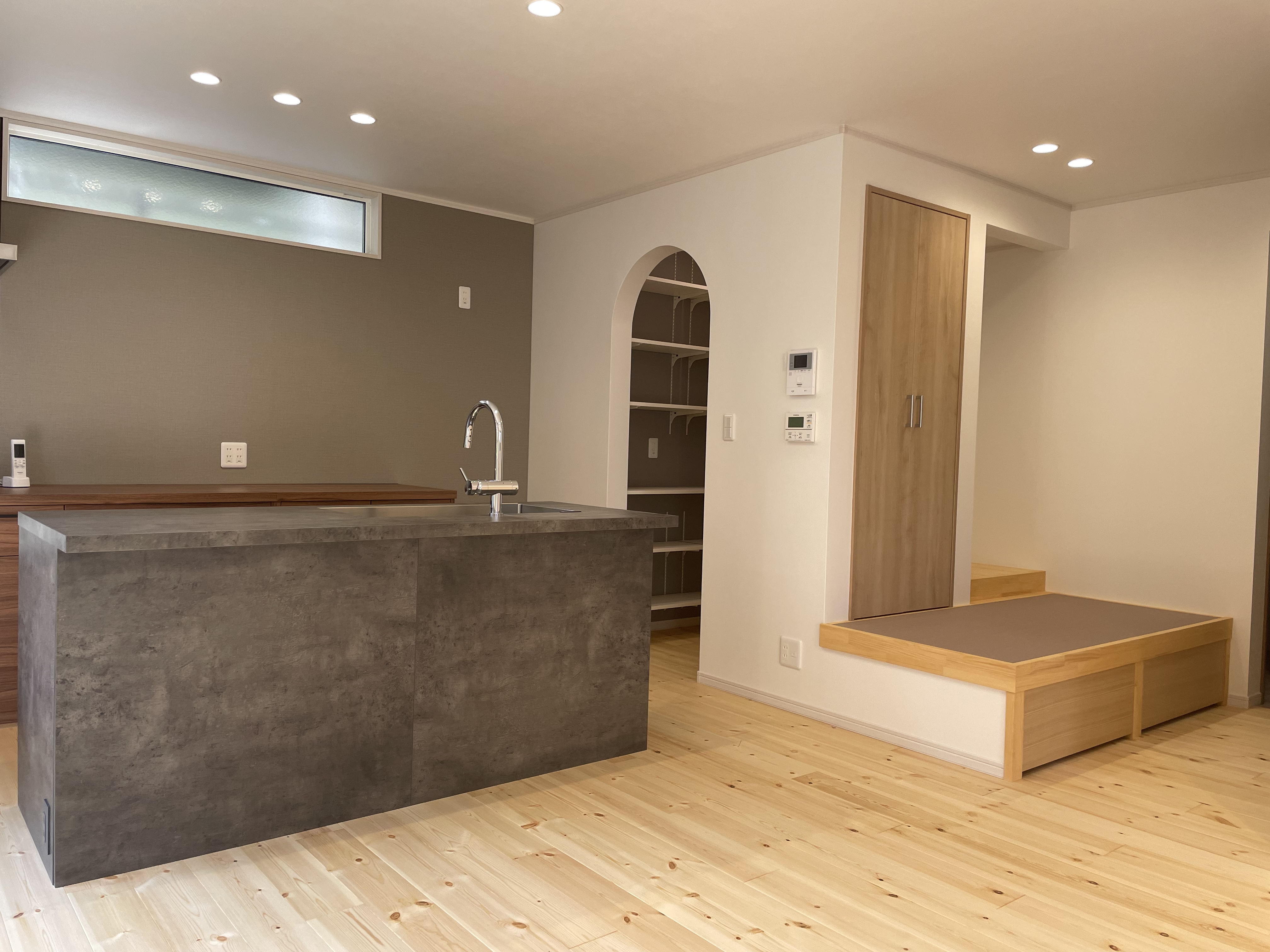 キッチンに隣接して大容量のパントリー (収納) と、小上がりの畳コーナーを設けました