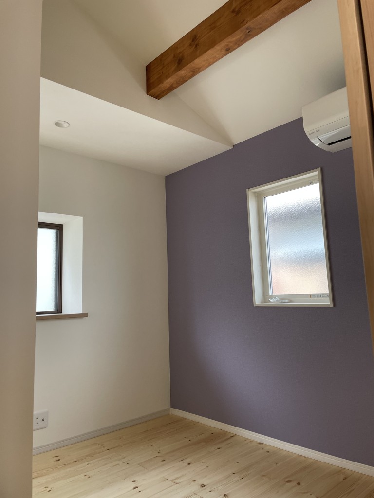 2階の洋室の天井を屋根なりに上げて、梁を現しにしています![]()